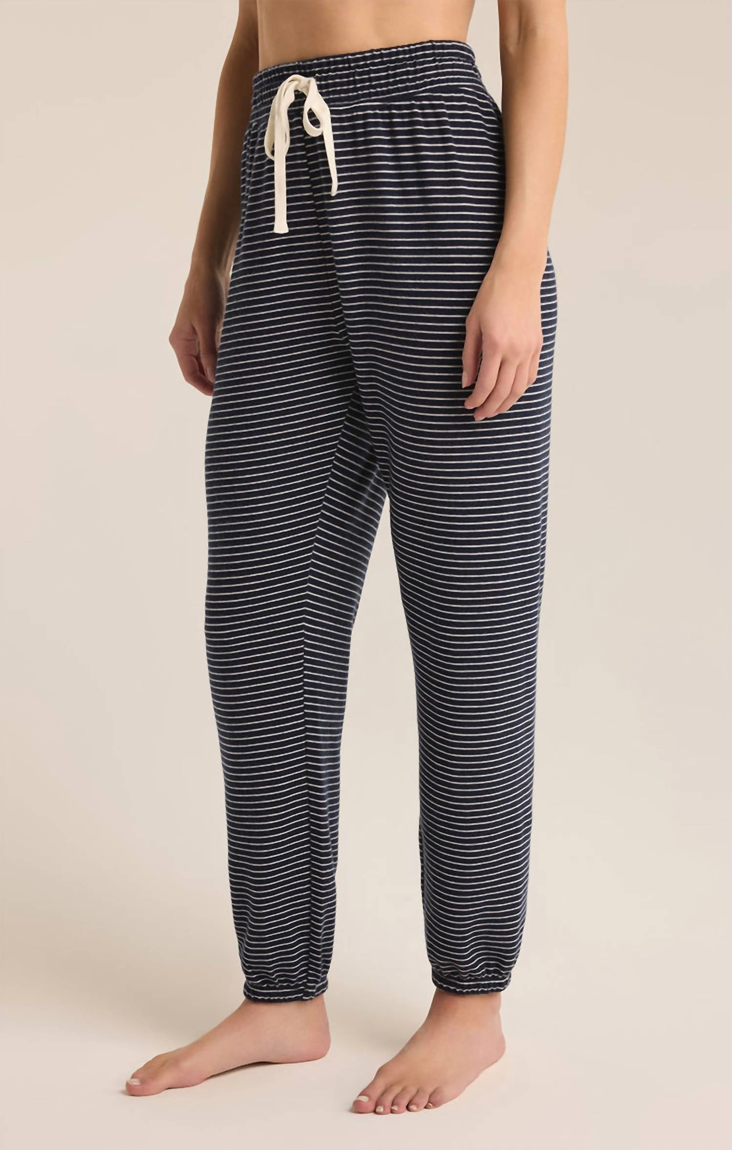 These joggers feature a relaxed fit, mid-rise design, and an elastic drawstring waistband. They are ankle-length and designed with classic stripes. Made from 62% polyester, 34% rayon, and 4% spandex. Machine wash cold, gentle cycle, tumble dry low or lay flat to dry.
