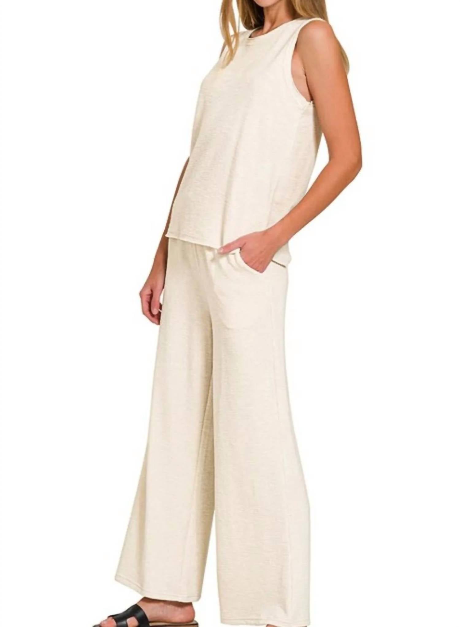 A set so cute you'll never want to take it off. Designed to look good while lounging, this little number is the perfect outfit for hanging at home in style. Elevate your loungewear with the ZENANA Cotton Slub Tank & Pants Set in Sand Beige, perfect for casual days and outings. This sleeveless set consists of a cozy tank top and matching pants, crafted from a cotton blend: 59% Cotton, 39% Polyester, and 2% Spandex, ensuring a soft and breathable experience. The pants boast an elastic waist for a comfortable, relaxed fit, while pockets add functionality to this basic style. Imported and designed for easy care, simply machine wash cold and tumble dry low. Available in size S: Bust 34-36 in, Waist 26-28 in, Hip 36-38 in; M: Bust 37-38 in, Waist 29-31 in, Hip 39-41 in; L: Bust 39-40 in, Waist 32-33 in, Hip 42-43 in.