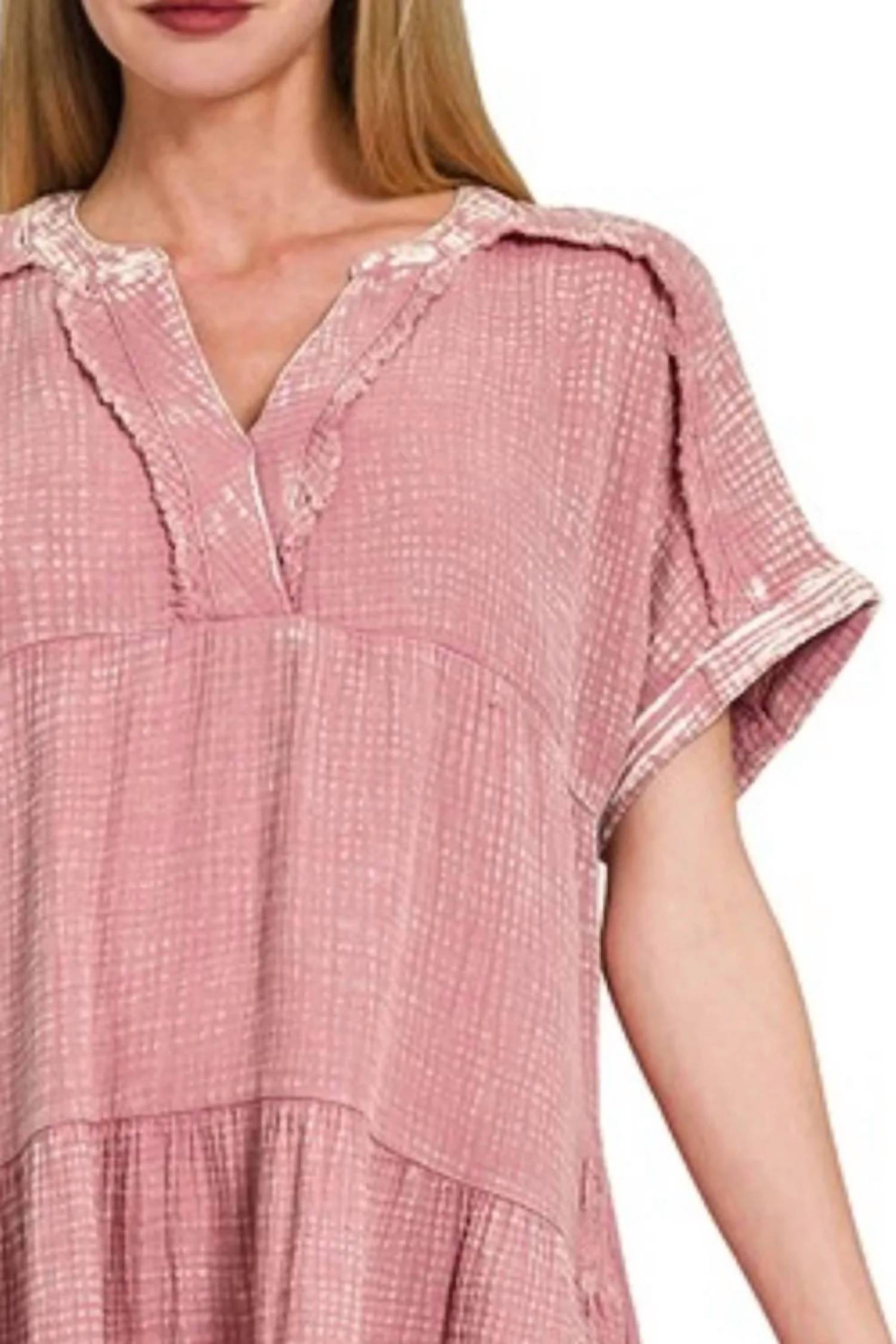 Zenana - Washed Double Gauze Raw Edge V-neck Dress