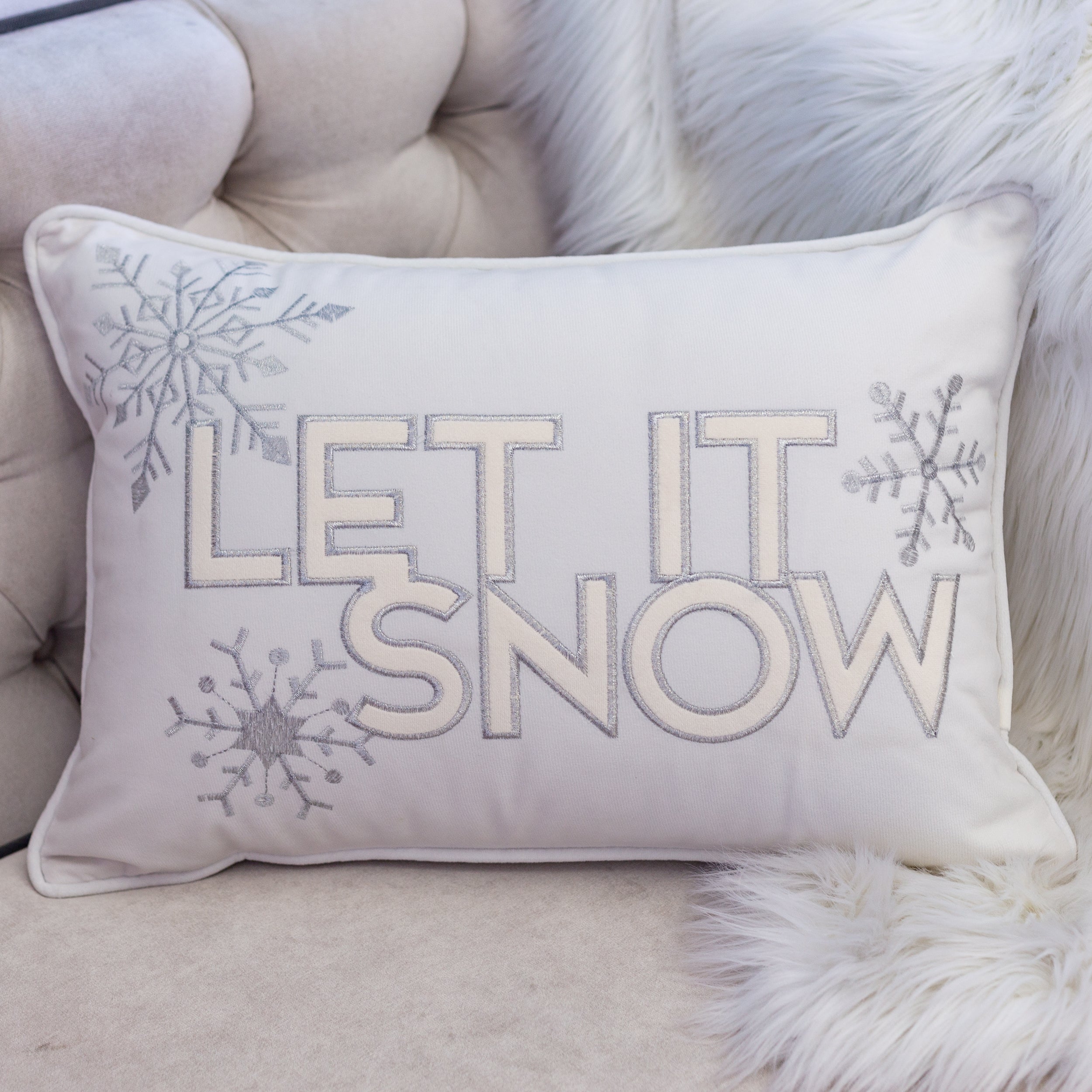 Bring a cozy, festive touch to your home with this 14"x20" lumbar pillow. Made from soft ivory velvet, it features elegant “Let It Snow” embroidery and delicate silver snowflakes, adding warmth and charm to sofas, chairs, or beds. Perfect for holiday décor, it provides both comfort and seasonal style.
