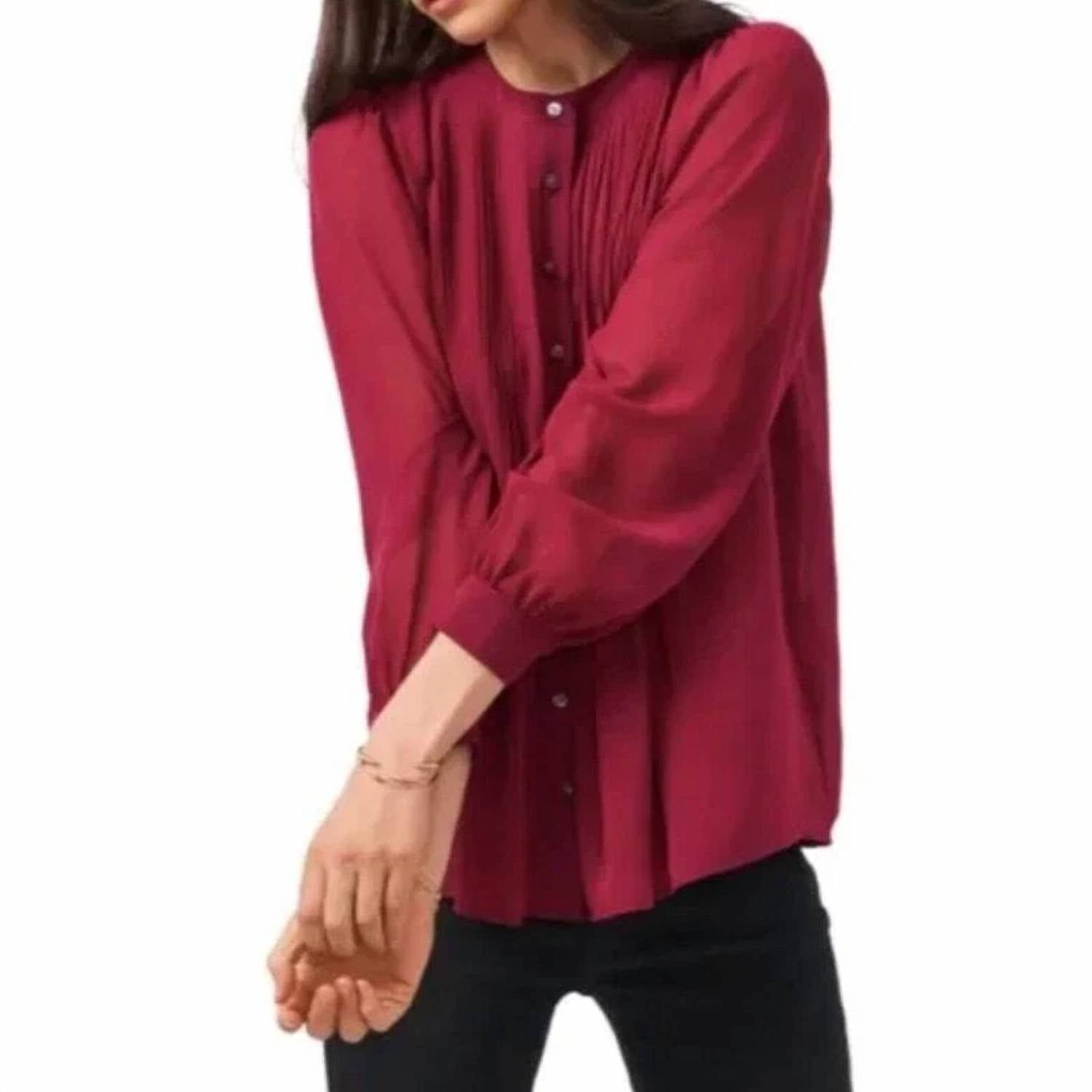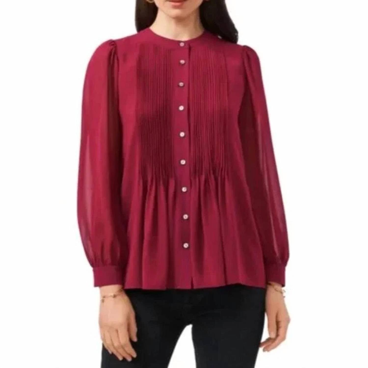 A timeless blouse that will never go out of style. The 1.STATE Pintuck Yoke Button-up Blouse in Ruby Plume is a charming addition to your wardrobe, exuding elegance with long puffed sheer sleeves and a jewel neckline. Made from 100% polyester, this refined top showcases delicate pintucks on a soft chiffon fabric, ensuring both comfort and style. The blouse is lined for added comfort, while the sleeves remain airy. Featuring a front button closure, it is easy to care for—simply machine wash and line dry.