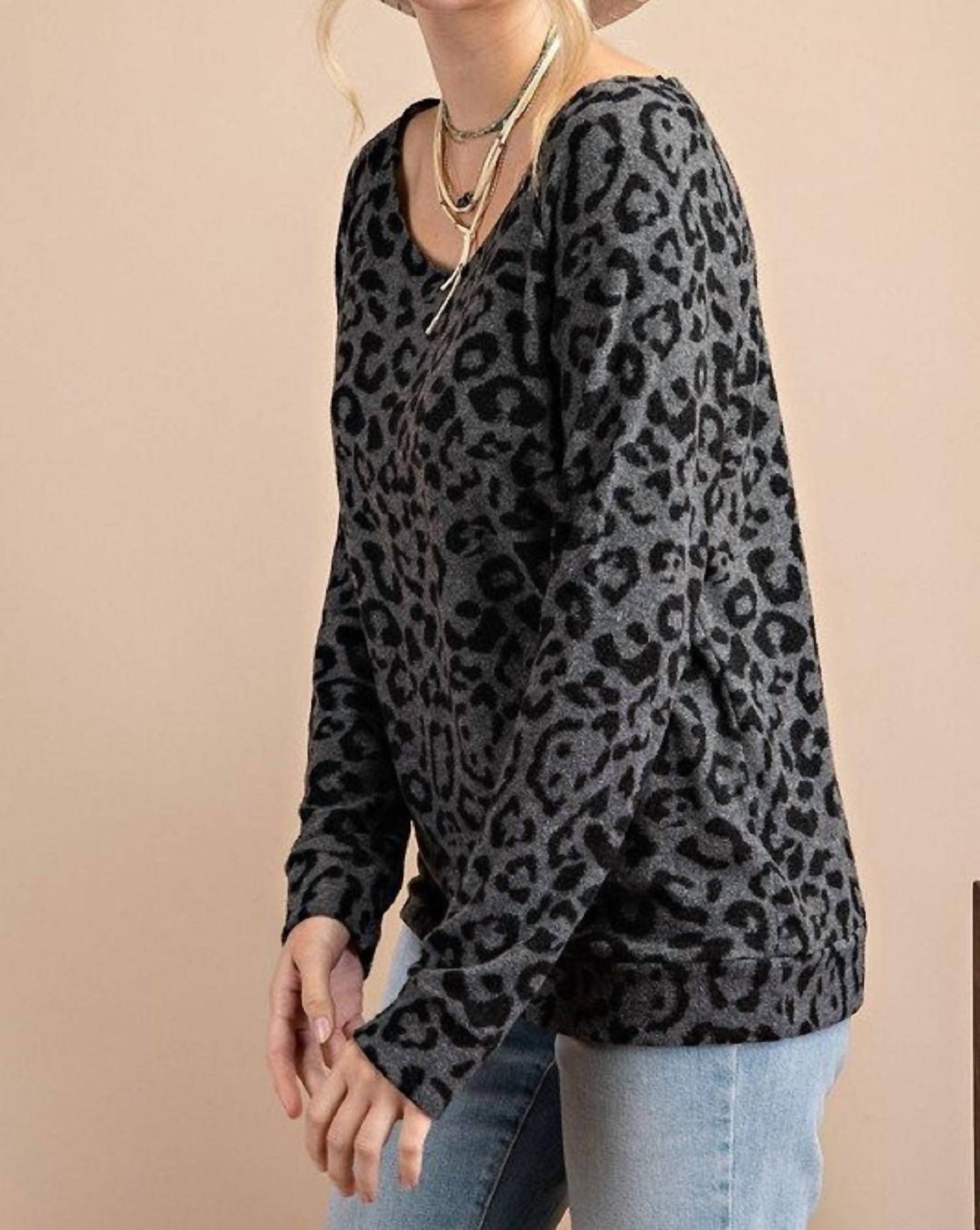 The perfect long sleeve tee that goes with just about anything. This Leopard Knit Top by 143 STORY effortlessly combines coziness and style for versatile wear. Crafted from polyester, this gray and black animal print tee features a chic boatneck and long sleeves. Its pull-on closure ensures ease of wear, whether paired with leggings for a casual look or jeans for a night out. Care for this garment is simple: hand wash and line dry to maintain its quality.