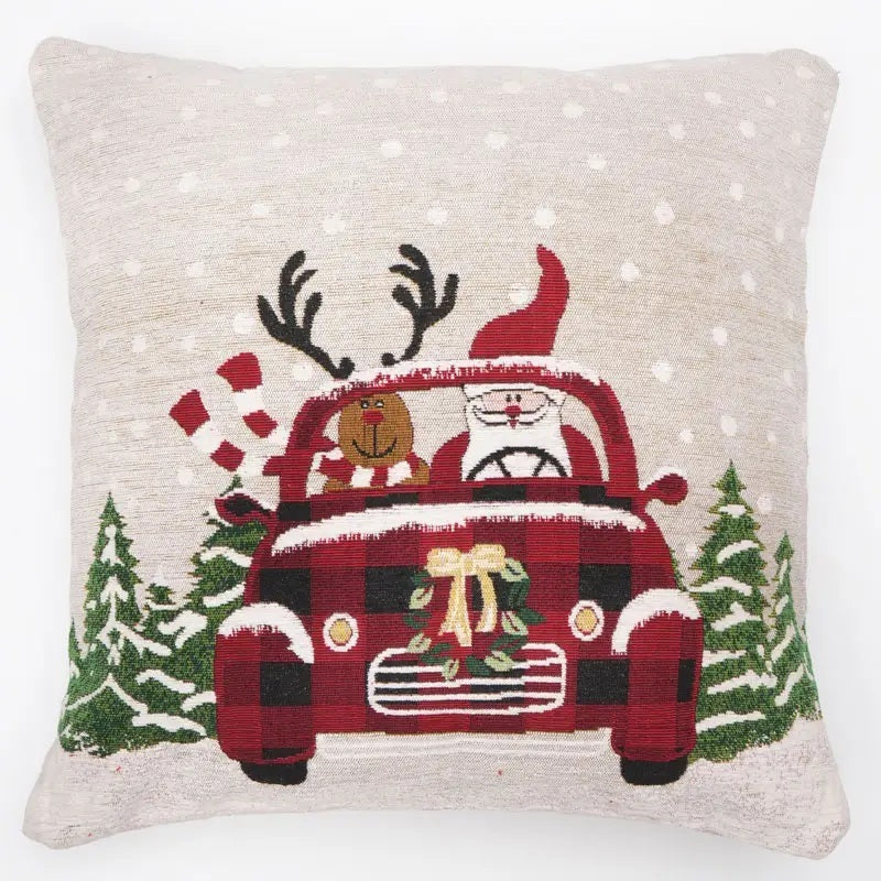 Add a festive touch to your holiday décor with this 24"x24" Santa’s Car decorative pillow, featuring a charming holiday illustration and handcrafted jacquard weaving. Perfect for sofas, chairs, or beds, it brings warmth, comfort, and seasonal cheer to any space.