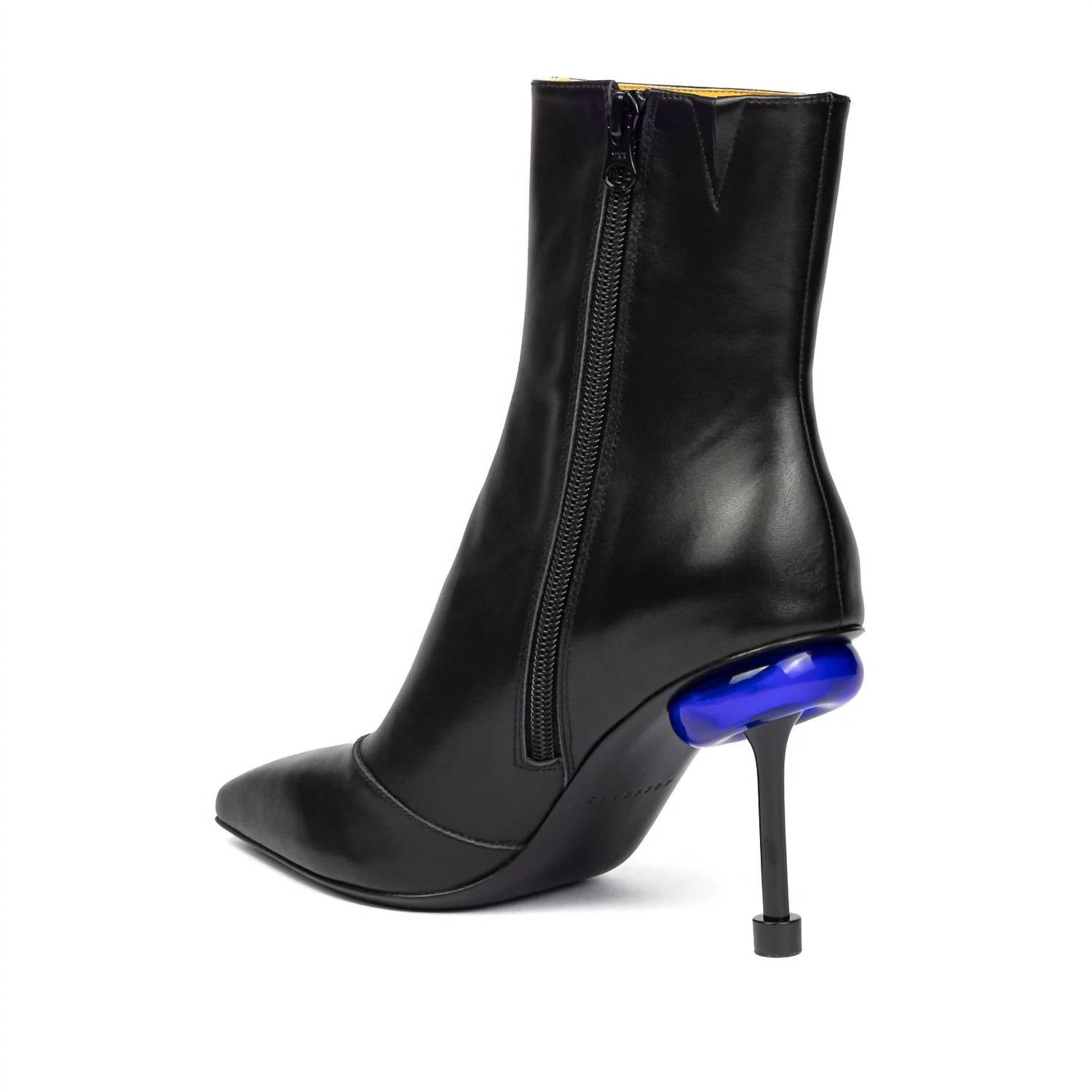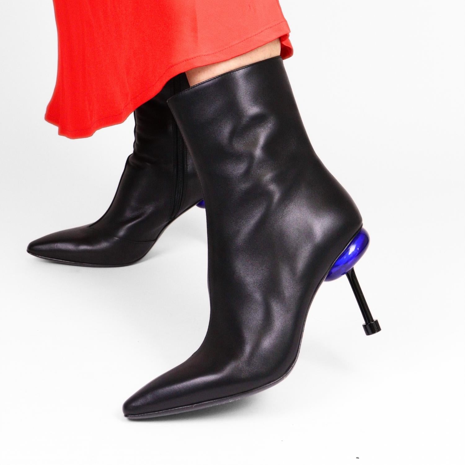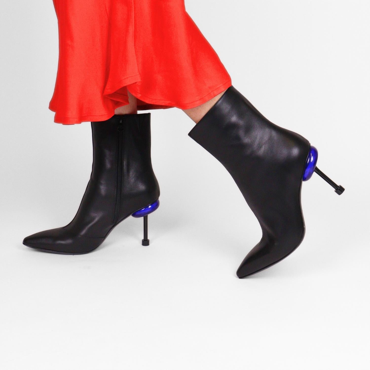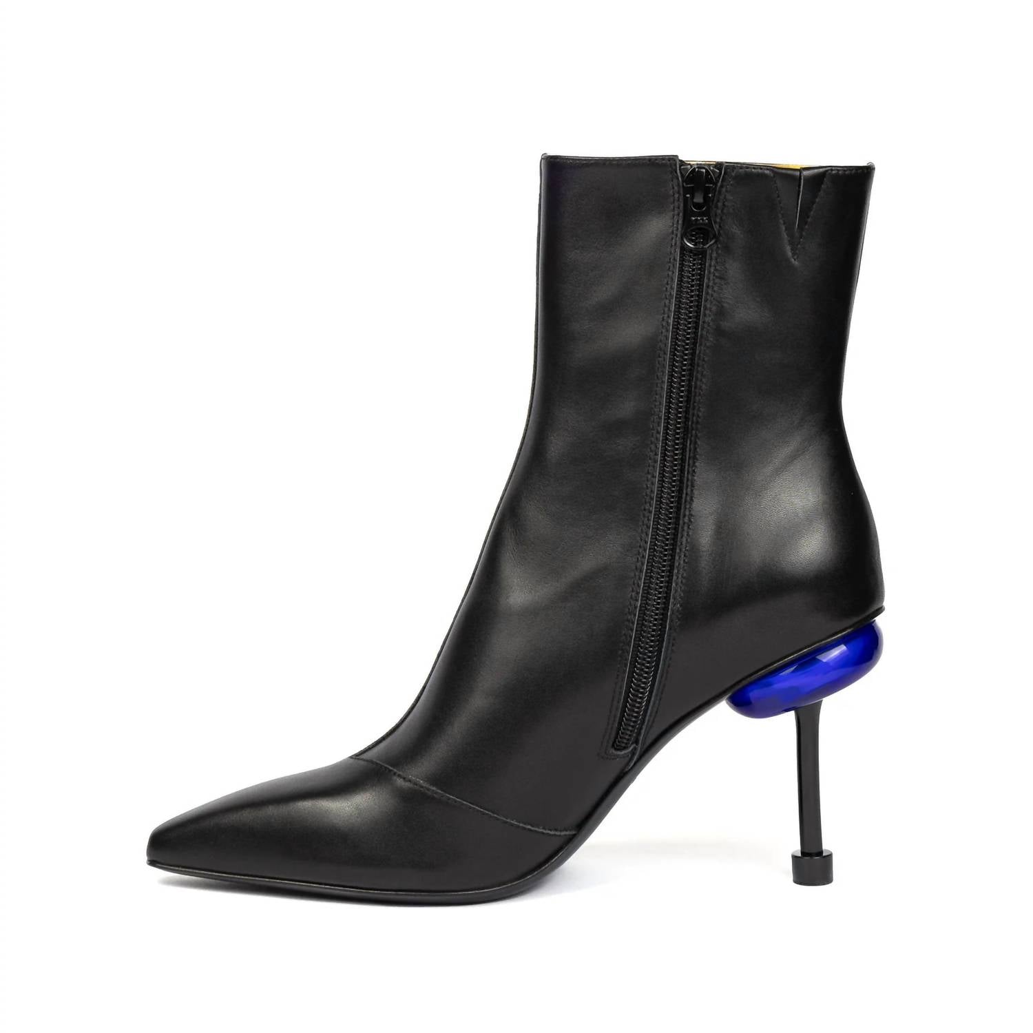 Step out in confidence and showcase your impeccable taste with these fashionable and versatile boots. Their classic style will have you reaching for these boots season after season. Step into elegance with the Osha Nox Hi ankle boots by 4CCCCEES, crafted in sleek Black Nappa. These heeled boots for women feature a pointed toe and contrasting pin-point stiletto heel, making them an ideal choice for formal occasions. A zipper fastening ensures ease of wear, while the metallic chrome and enamel-painted heel paired with an oversized top section add a touch of chic allure. Though not recommended for an athletic calf, these sculptural shoes are perfect for those seeking a refined, artistic look.