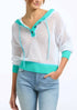 Get ready for vacation in this fun color block Henley-style crochet hoodie. Framed with a contrast rib hem. The perfect cover up.