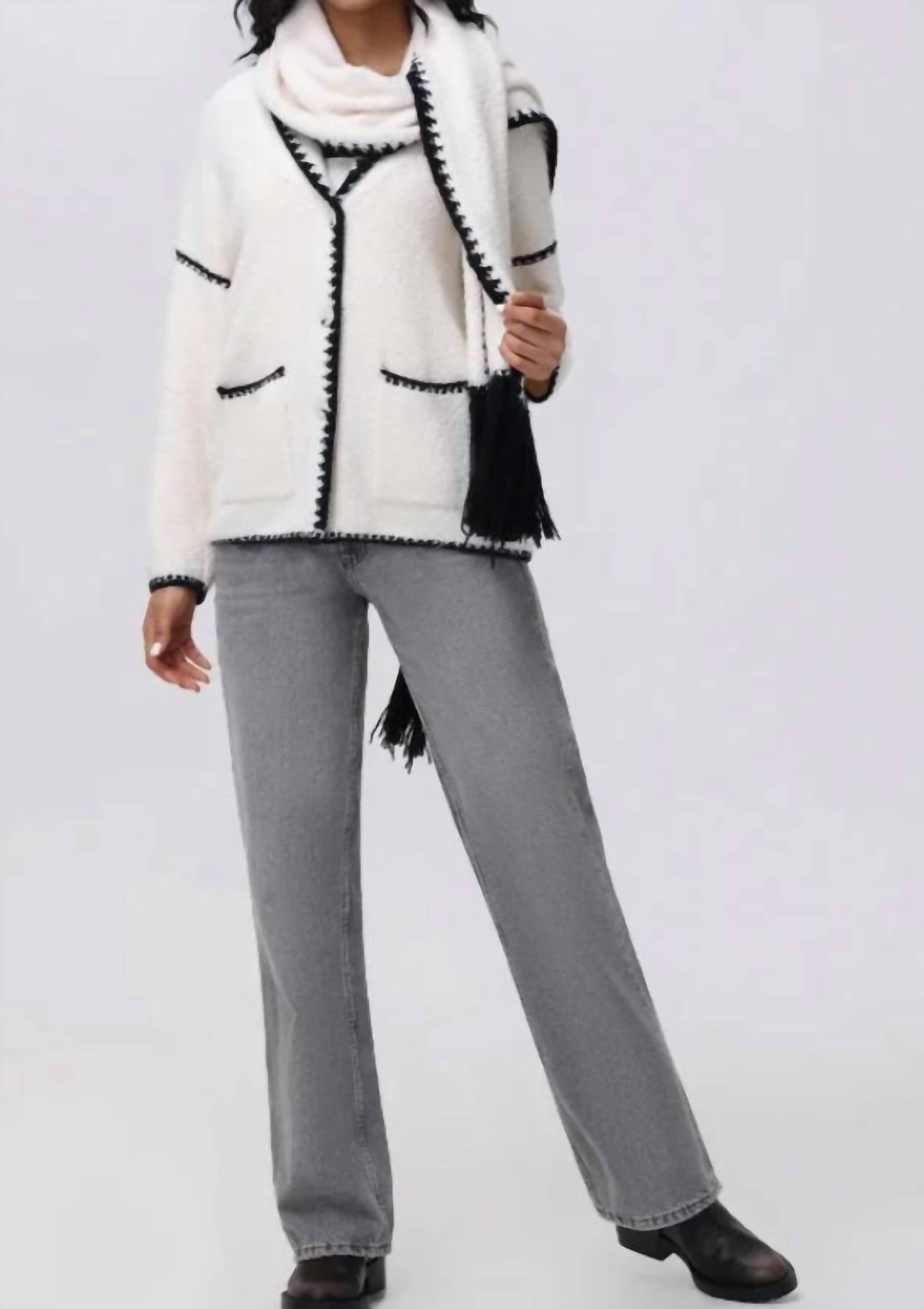 The whipstitch detailing throughout and drop shoulder design add a touch of casual sophistication, making this cardigan a chic addition to your wardrobe. Includes the scarf as well.