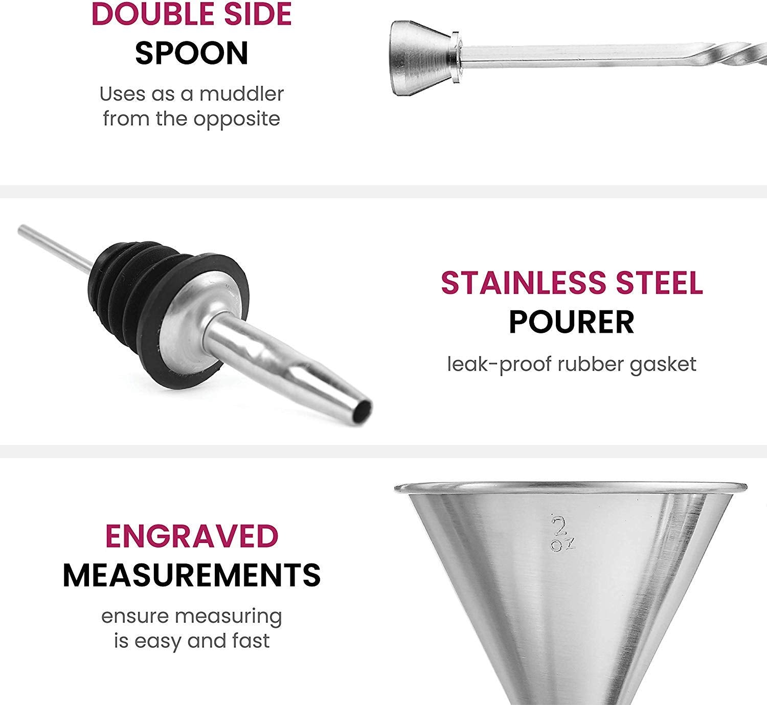 • COMPLETE BAR SET- Achieve a perfectly smooth cocktail with completely integrated ingredients. Set includes a 28 and 18 oz cocktail shaker with a lid and filter that’ll keep chunks and ice contained, a double jigger of 1 and 2 oz, a muddler, a beer and soda opener, 6 bottle pourers, and a Hawthorne cocktail strainer
