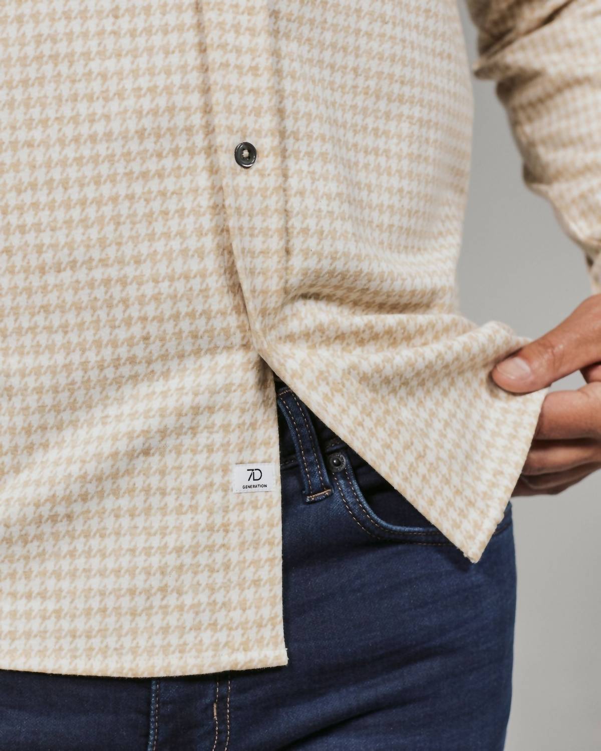 A classic button down shirt that will never go out of style. Elevate your workwear collection with the 7Diamonds Generation Knit Button Down Shirt in a sophisticated tan houndstooth pattern. This women's shirt is crafted from a luxurious blend of 72% Polyester, 15% Cotton, 12% Rayon, and 1% Spandex, providing excellent four-way stretch and softness. It features long sleeves with adjustable cuffs, a front patch pocket, and a classic collar, secured with a button closure. Care: Turn inside out and machine wash cold on a delicate cycle with similar colors, iron on low, do not bleach, line dry or dry flat, and it's safe to dry clean.