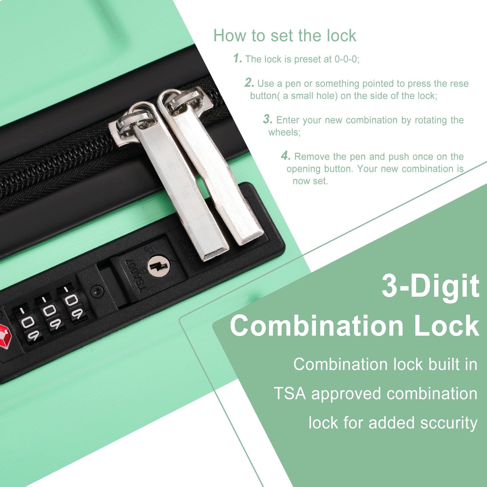 • Lock: TSA-approved 3-dial combination lock