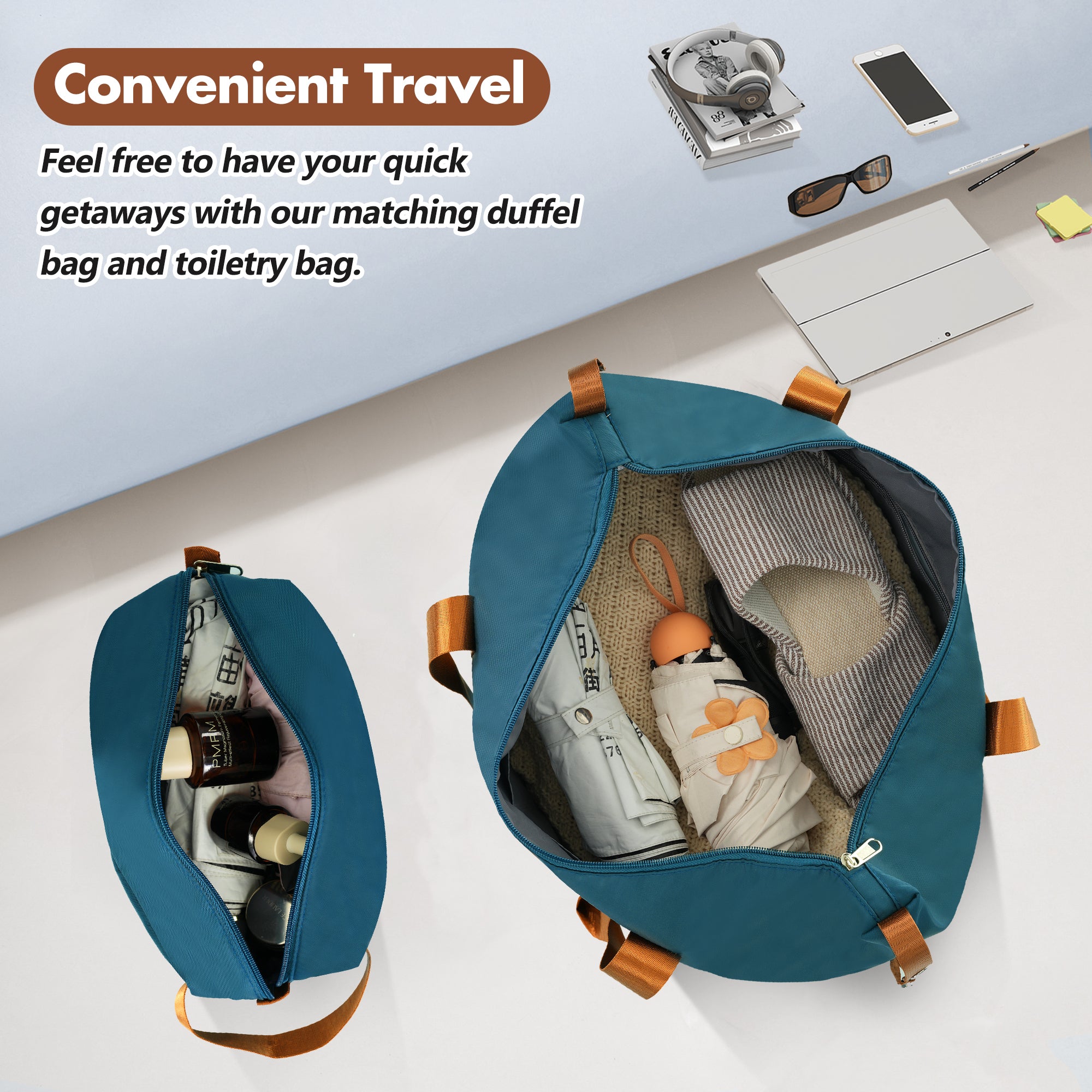 Includes a 28-inch suitcase, expandable duffel bag, and toiletry bag — ideal for extended trips or family travel. The duffel features a trolley sleeve with a zippered pocket, allowing you to conveniently attach it to the suitcase handle for easy transport.