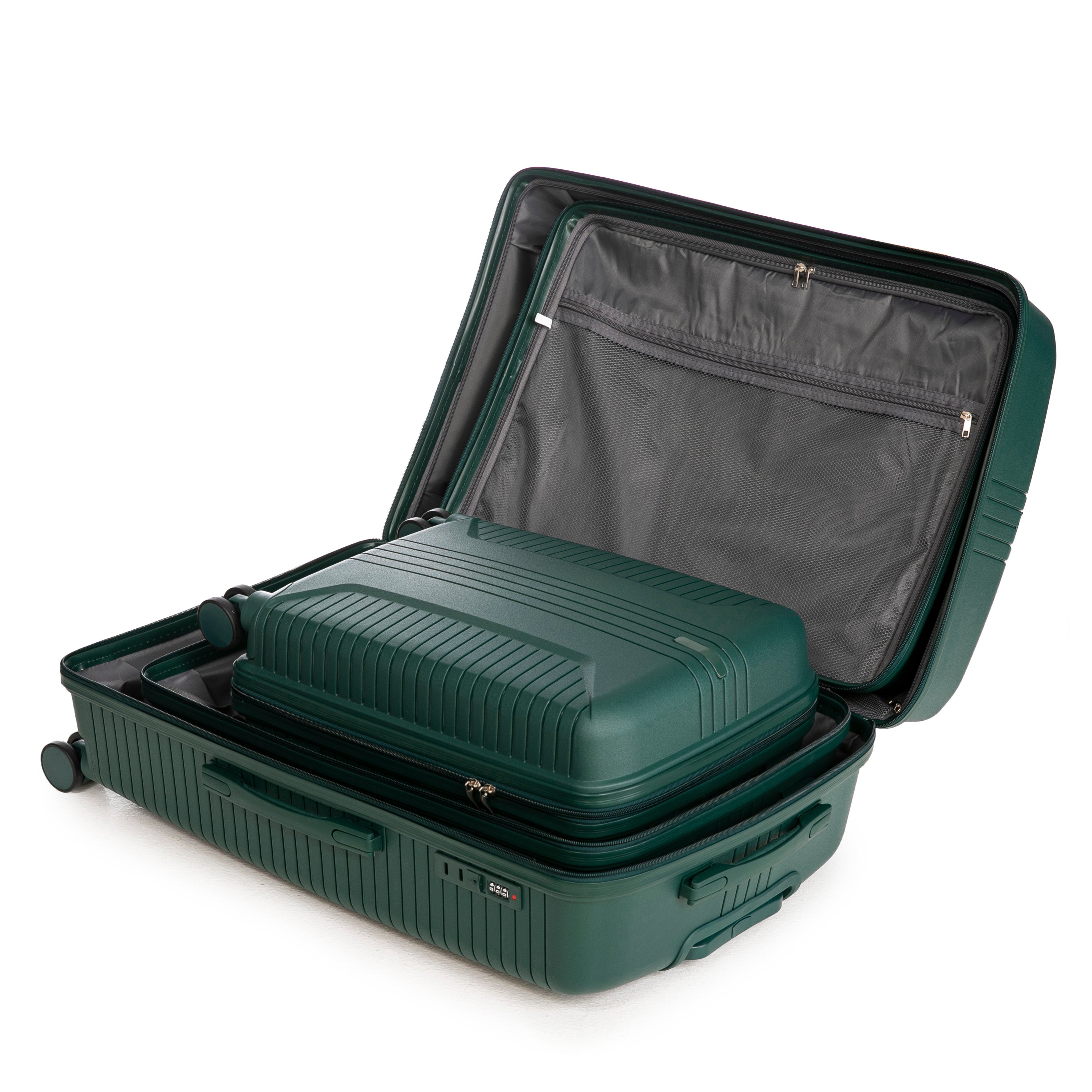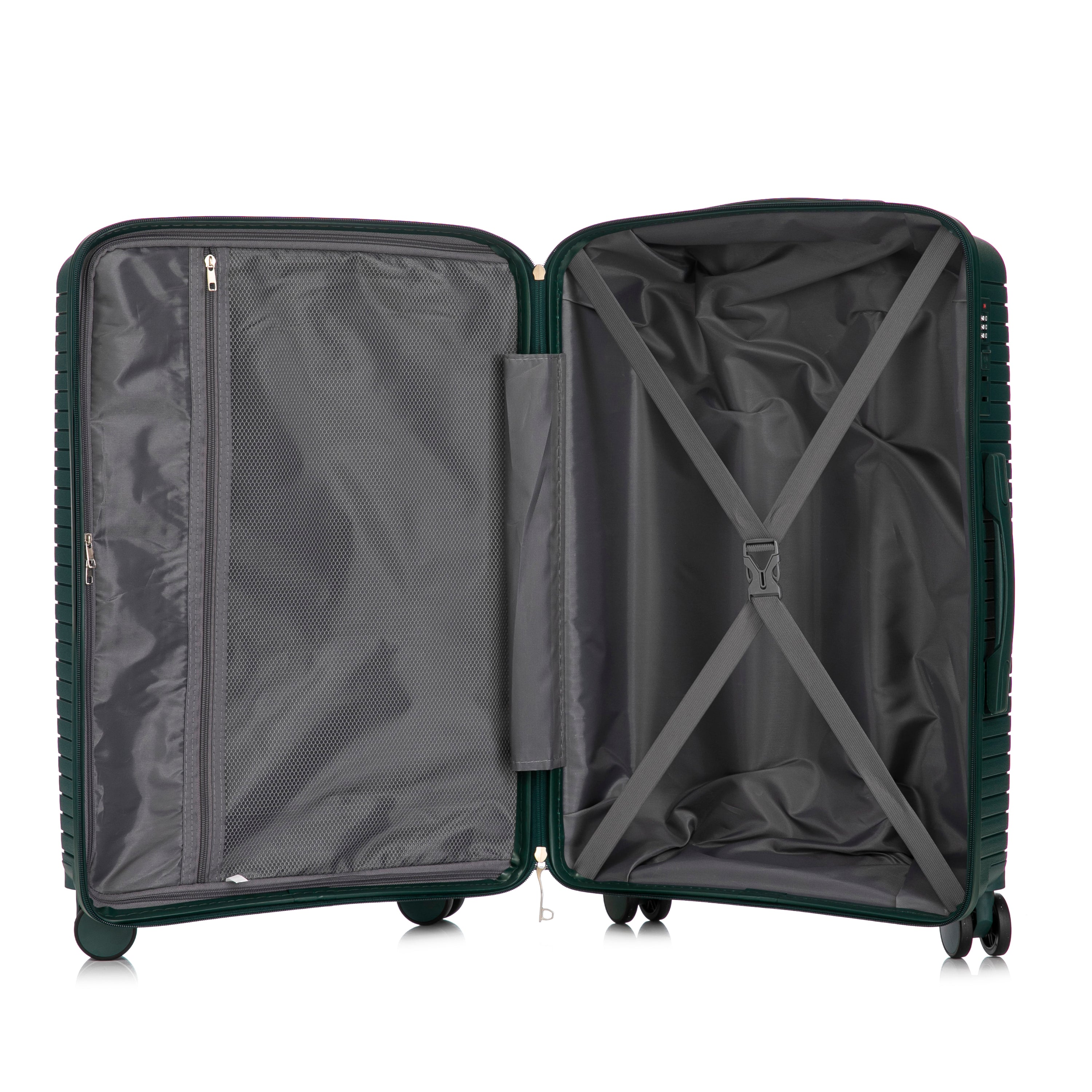 Each suitcase includes a fully lined interior with a zippered compartment, cross straps, and multiple storage layers to keep your belongings neatly organized. The low-profile top and side handles make lifting and carrying easy.