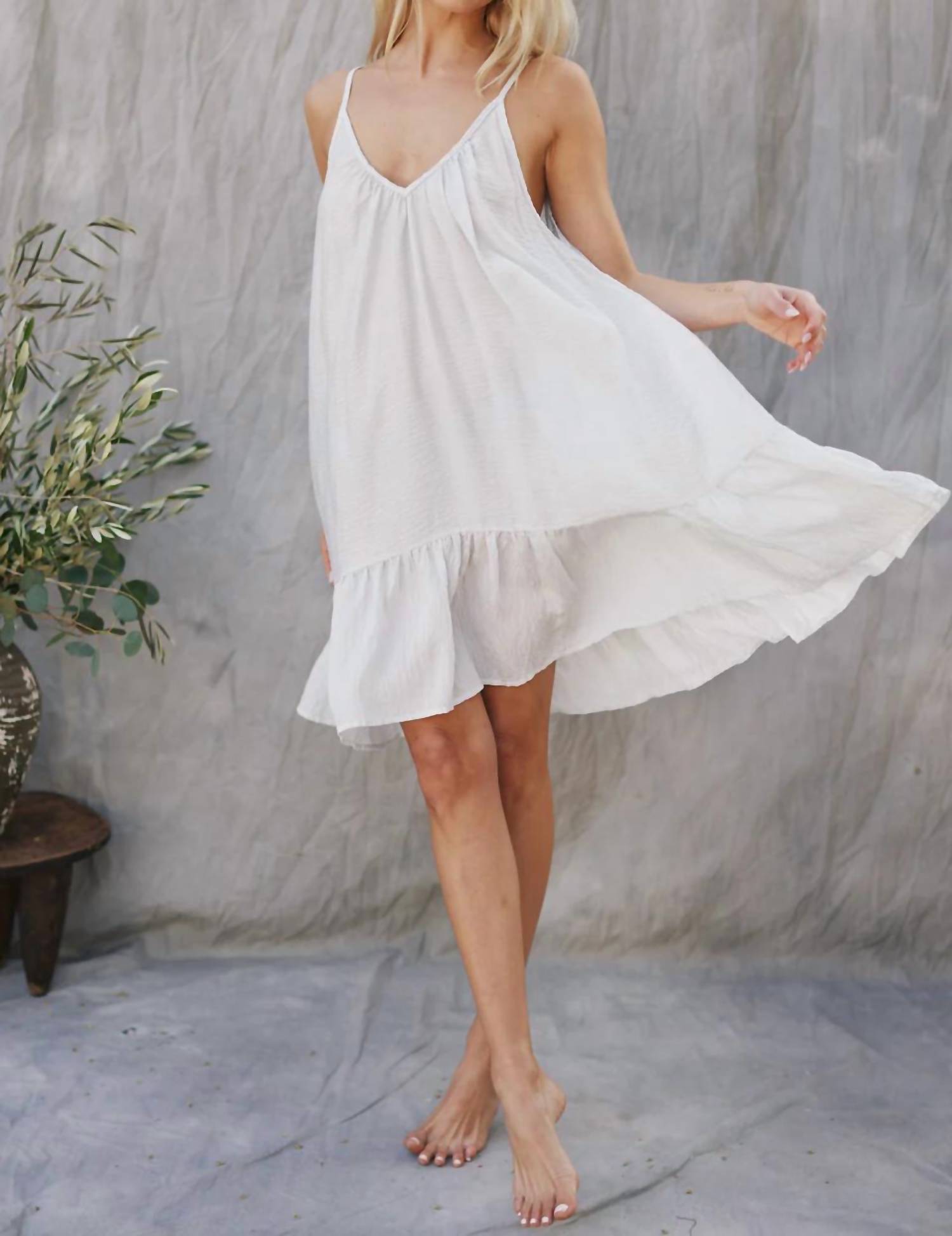 The kind of easy and flattering dress you'll be reaching for all season long. Embrace effortless summer style with the St Tropez Ruffle Mini Dress by 9seed in pristine white. This sleeveless shift dress features spaghetti straps and a delicate flared skirt with drop-waist pleating. Made from a silky blend of 84% Rayon and 16% Nylon, it measures 34.5 inches from shoulder to hem, providing a relaxed, minimalist look perfect for a beach day. Crafted in the USA, this dress requires hand washing and laying flat to dry, ensuring its delicate fabric maintains its elegance.