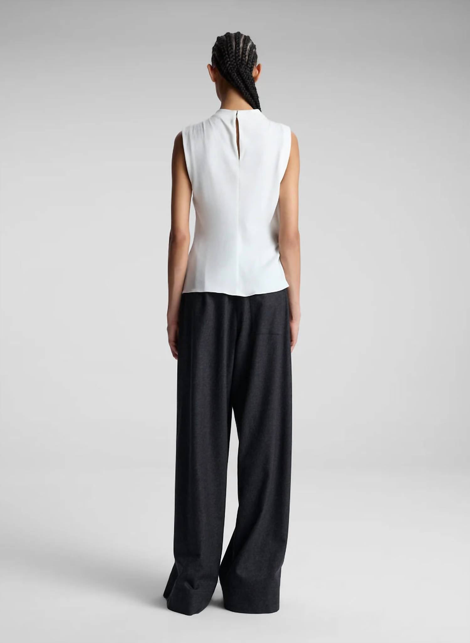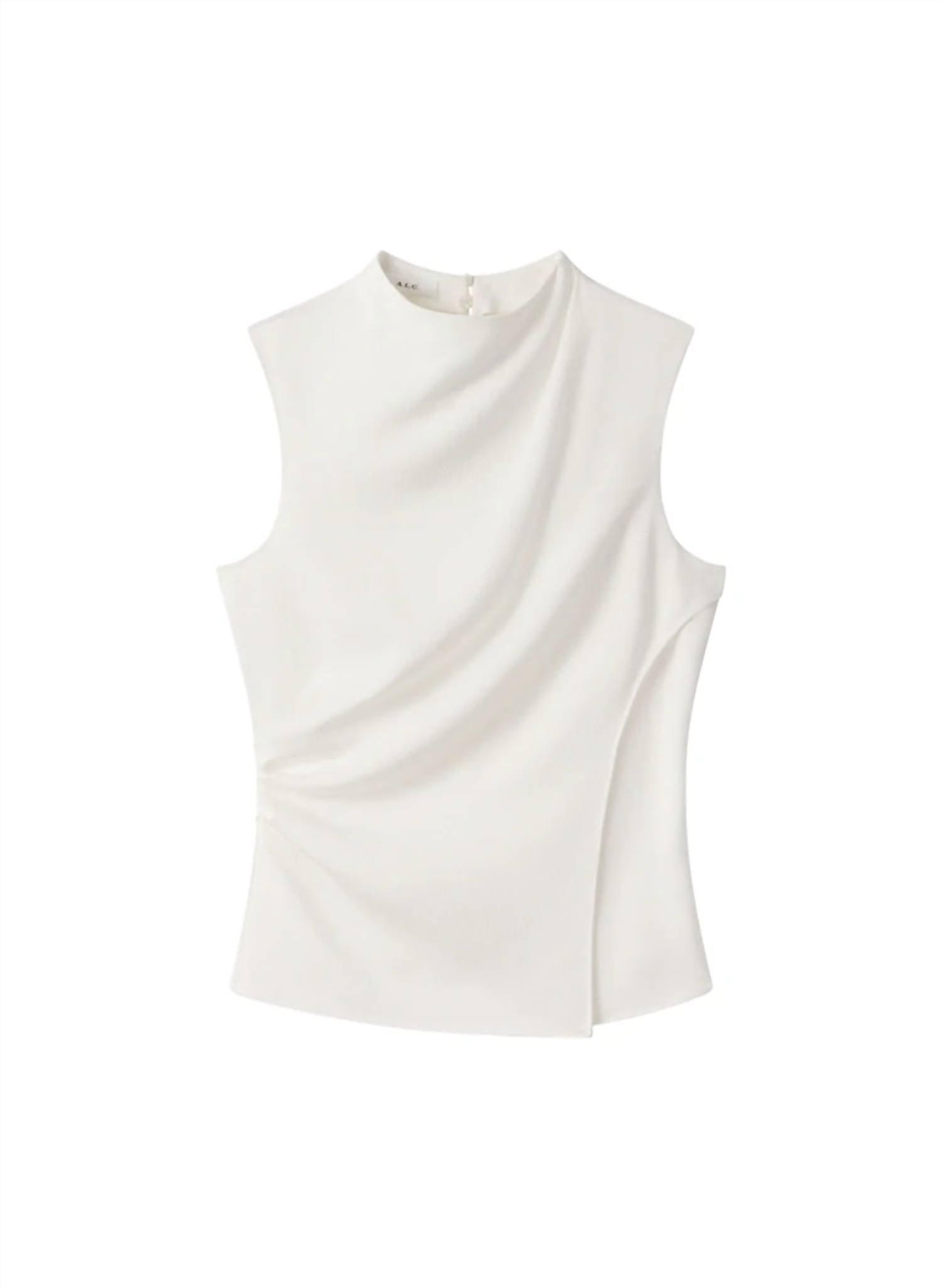 Enhance your wardrobe with the elegant Amira Ruched Sleeveless Top by A.L.C., designed in a sophisticated off-white hue. This piece is crafted from hammered crepe fabric, featuring a chic cowl neckline and a stylish wrapover detail enhanced by side seam gathering. Composition: 77% Acetate, 23% Polyester, with a 100% Polyester lining. Garment Length: 25.25 inches. Closure: Button closure. Care: Dry clean only. Model is wearing a size 4 (5'9.5" height, 30.5" bust, 23" waist, 34" hips).