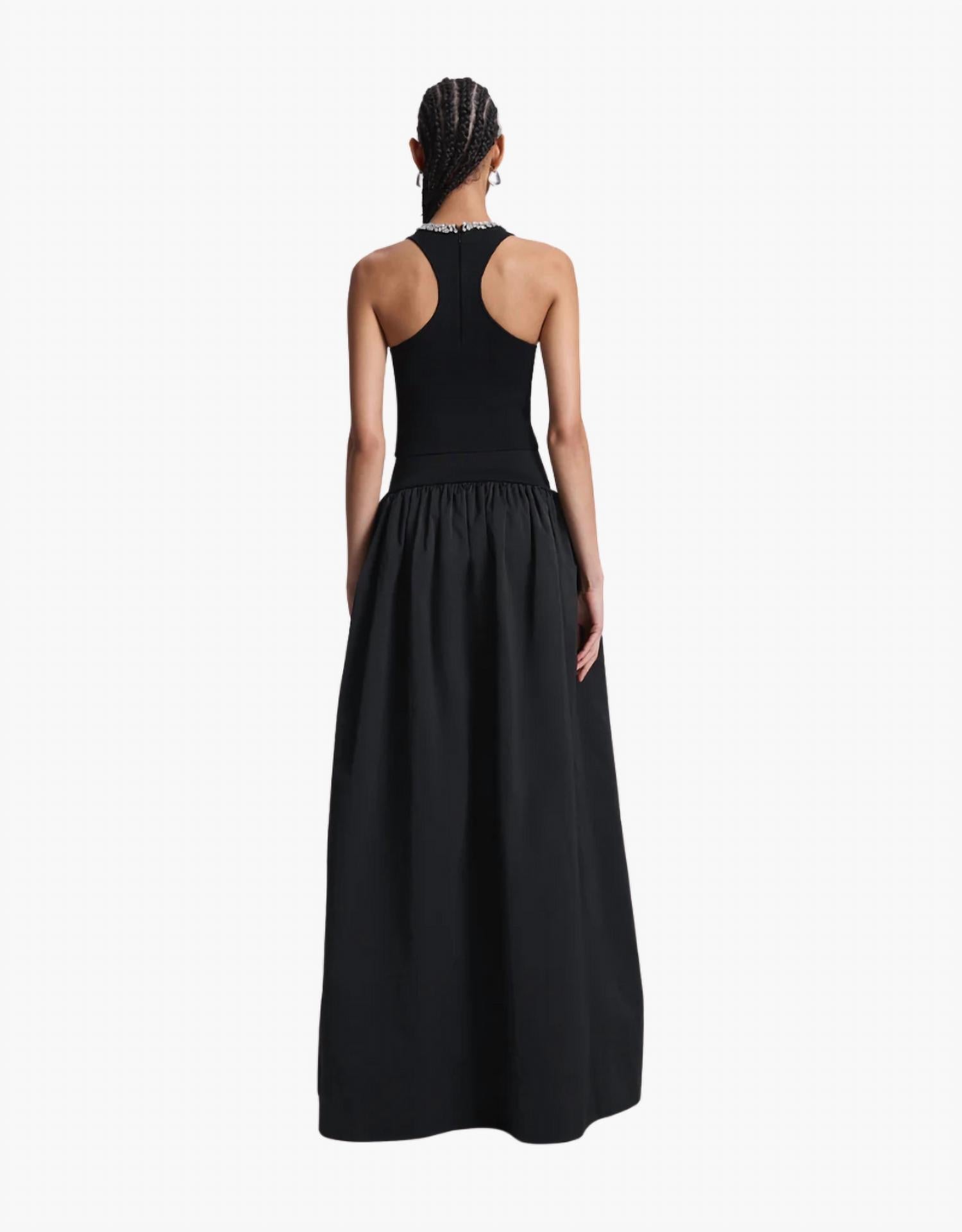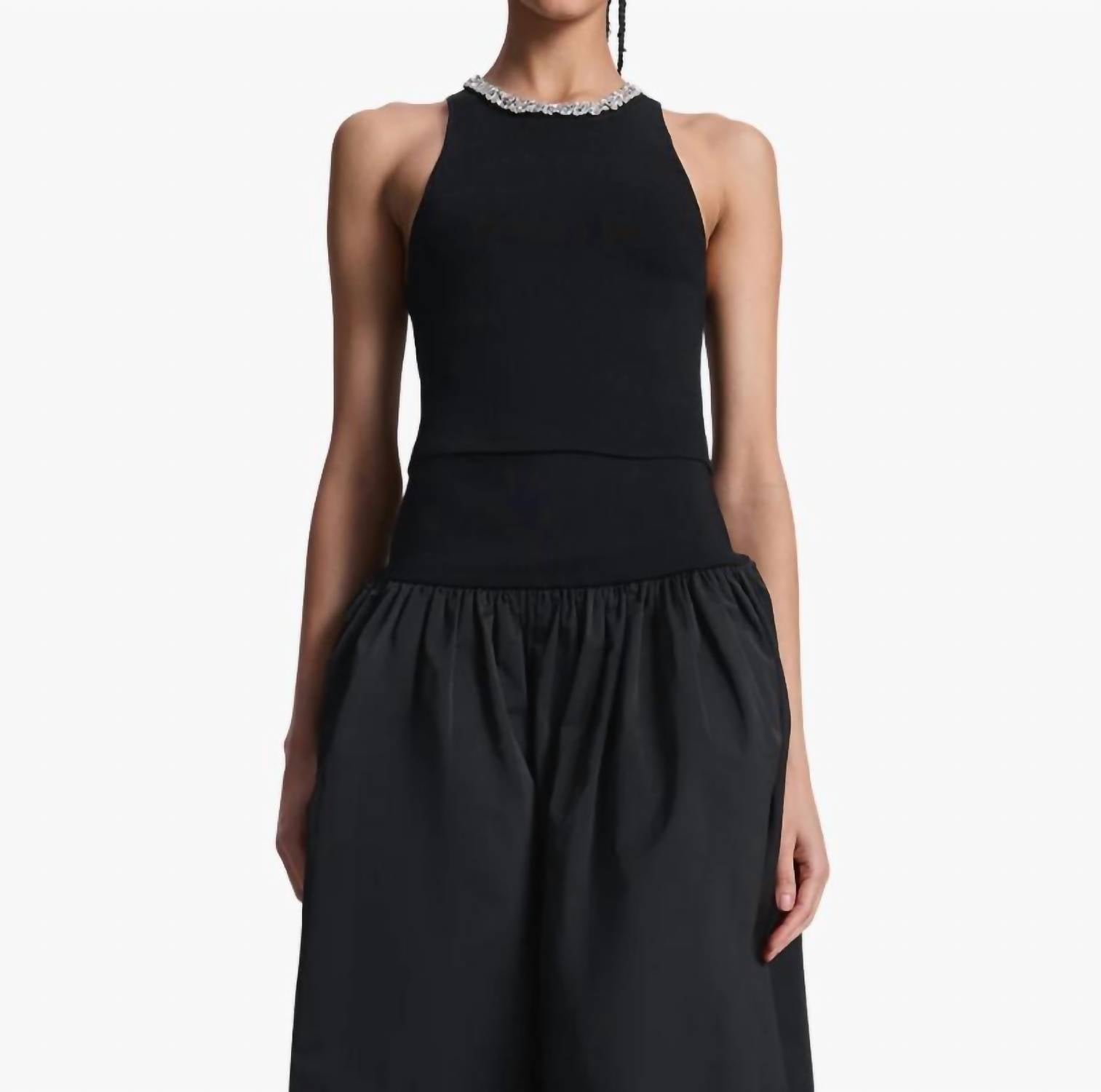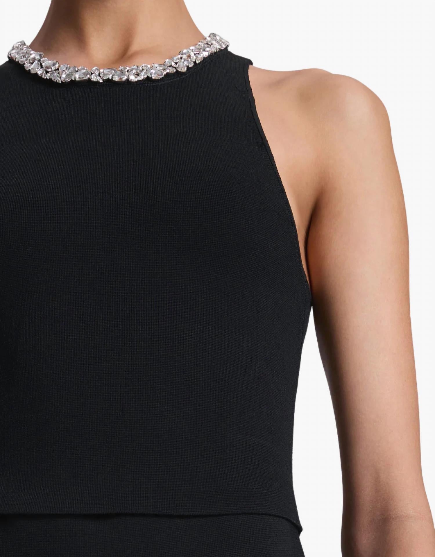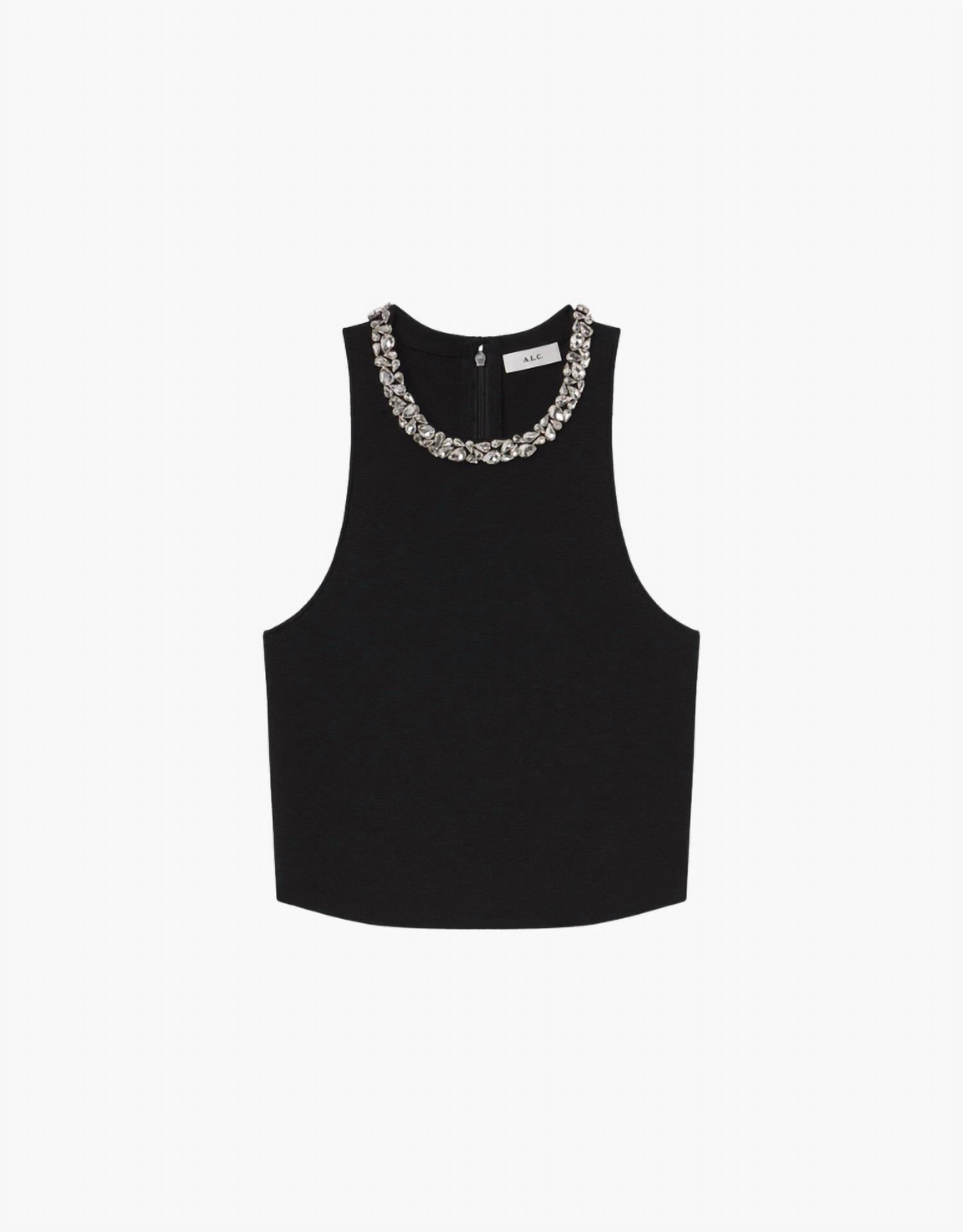 Fit, fabric and functionality. This tank top checks all the boxes. The Bella Top by A.L.C. is an elegant addition to any wardrobe, featuring a jeweled neckline and a sleek, cropped silhouette that measures approximately 16 inches from shoulder to hem. This sleeveless, fitted tank top is expertly crafted from a blend of 76% rayon, 22% nylon, and 2% elastane, offering both comfort and a refined look. The concealed back zip closure ensures a seamless fit, while its imported quality suggests careful attention to detail. For best results, ensure to dry clean this chic, versatile black top. Model wears a US size Small and stands at 5'10".