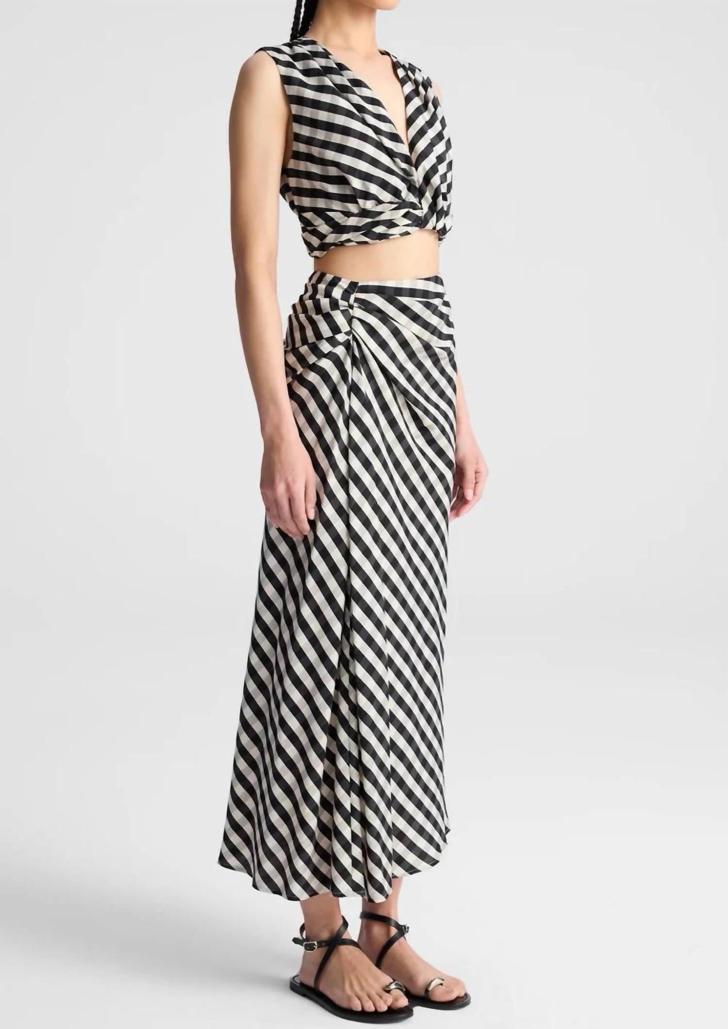 Introducing the Brooklyn Pull On Top by A.L.C., a must-have addition to your spring wardrobe with a touch of quiet luxury. This striped tank top offers a chic black and tan colorway and a V-neck for a stylish silhouette. It is crafted from a blend of 59% Viscose, 25% Tencel® Lyocell, and 16% Nylon, offering comfort and durability. Designed for women and suitable for vacations or Valentine's Day outings, this sleeveless piece is a pull-on style that requires dry cleaning to maintain its pristine condition.