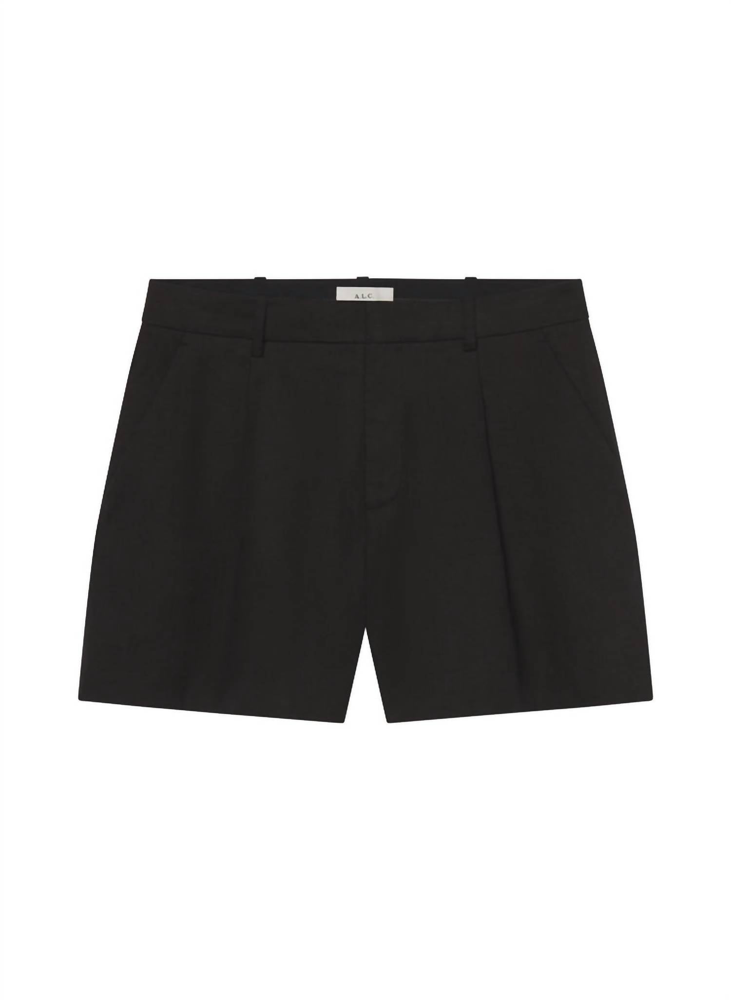 Introducing the Charles Shorts by A.L.C., crafted from a refined Italian stretch linen cotton blend in classic black. These women's high-waist shorts feature an elegant high-rise with front pleating, relaxed wide legs, and a tailored silhouette that hits mid-thigh. With a practical zip closure, they are designed with side slash pockets and back welt pockets for added functionality. Composition: 65% Linen, 34% Cotton, 1% Elastane. Care: Dry clean only. Model is 5'10" and is wearing a size 4. Rise: 13.375 inches; Inseam: 3 inches.