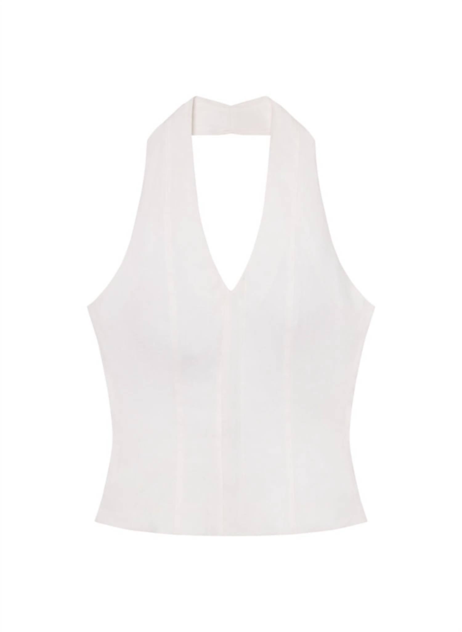 Fit, fabric and functionality. This tank top checks all the boxes. Elevate your wardrobe with the A.L.C. Cora Top in sophisticated Ecru, a stunning piece for versatile occasions. This sleeveless tank features a fitted halter silhouette with a sharp V neckline, complemented by a concealed front zipper. Crafted from a blend of 65% Linen, 34% Cotton, and 1% Elastane with a lining of 51% Polyester and 49% Cotton, it offers both comfort and style with a length of 24.75 inches hitting at the high hip. Care for this solid pattern garment with ease as it requires dry cleaning to maintain its clean lines and structured fit.