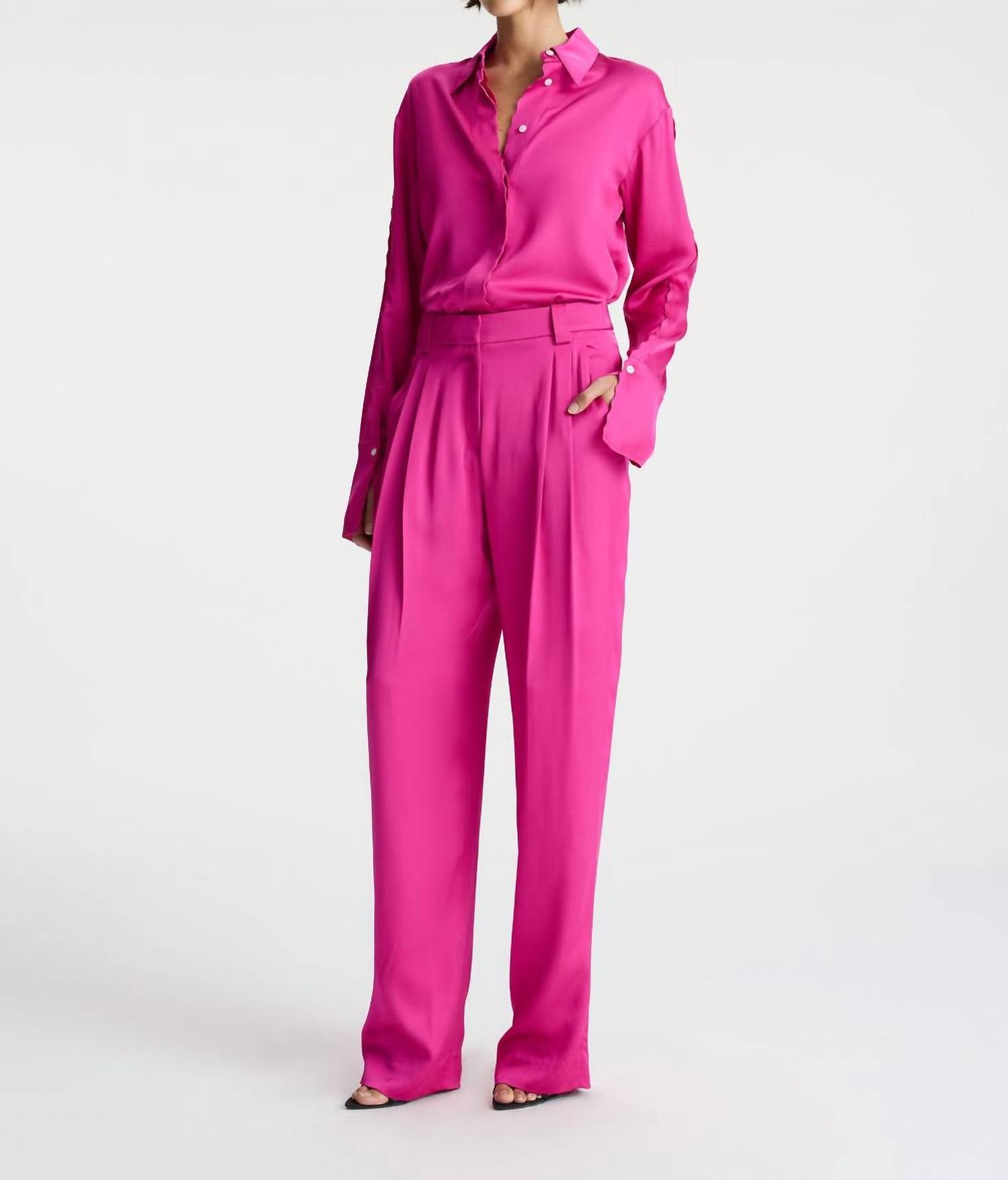 Introducing the Fynn Pant by A.L.C., beautifully designed in vibrant Disco Pink to make a bold statement. These straight-leg trousers, crafted from 100% fluid satin viscose, offer a drapey and loose fit, featuring a mid-rise waist, front pleating, and practical slash pockets. The pants are partially lined, with a hook & bar and fly zipper closure, measuring a length of 33 inches. Care for these stylish trousers with a dry clean only regimen. The model pictured is 5'10.5" and wears a size 4, with measurements of bust 31.5", waist 25", and hips 36".