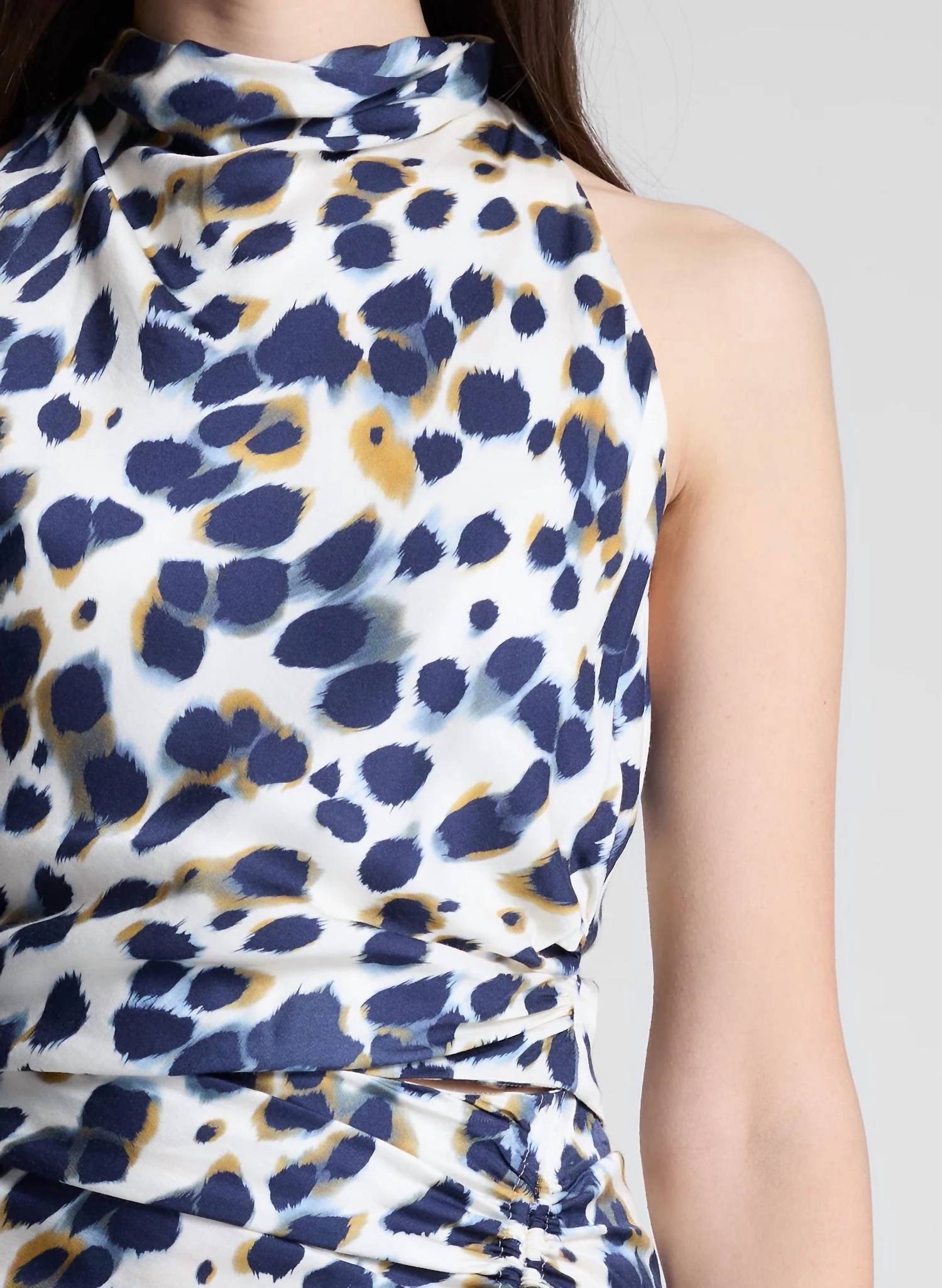 Discover the Lily Printed Sleeveless Top by A.L.C., a sophisticated piece showcasing a high neckline and intricate ruched side detailing. Crafted from 100% viscose twill with an artful color palette of navy, mustard, and light blue, this top offers a chic, figure-skimming fit. It features a discreet back zip closure and measures 16.75" in length. For optimal care, this top requires dry cleaning. Model is 5'9.5" wearing a size 4 with product measurements: bust 32.5", waist 29.5".