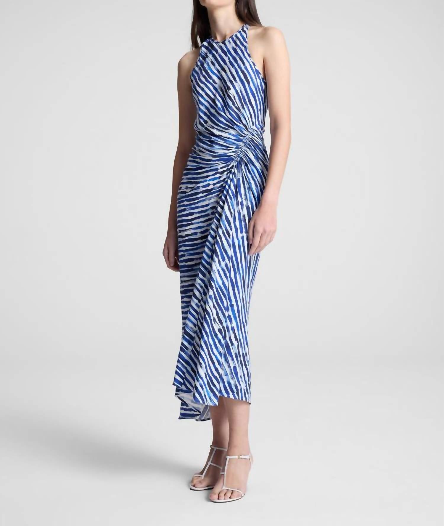 The perfect length dress does exist. Introducing the Ruby Midi Dress by A.L.C., a chic choice for your evening events. This sleeveless dress is crafted from luxurious silk linen poplin and showcases a striking navy Mariniere stripe pattern. Its halter neckline and asymmetrical ruched detailing at the hip add dynamic, sculptural movement to the design. Perfect for the boho chic trend this spring, the Ruby Midi Dress is the ideal addition to elevate your wardrobe.