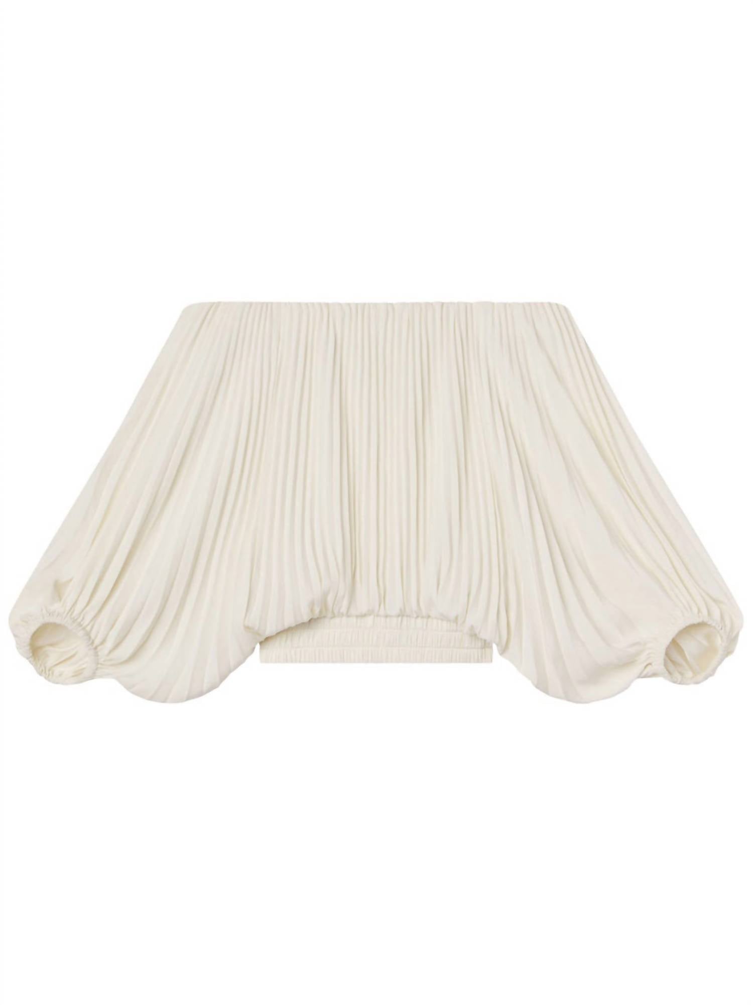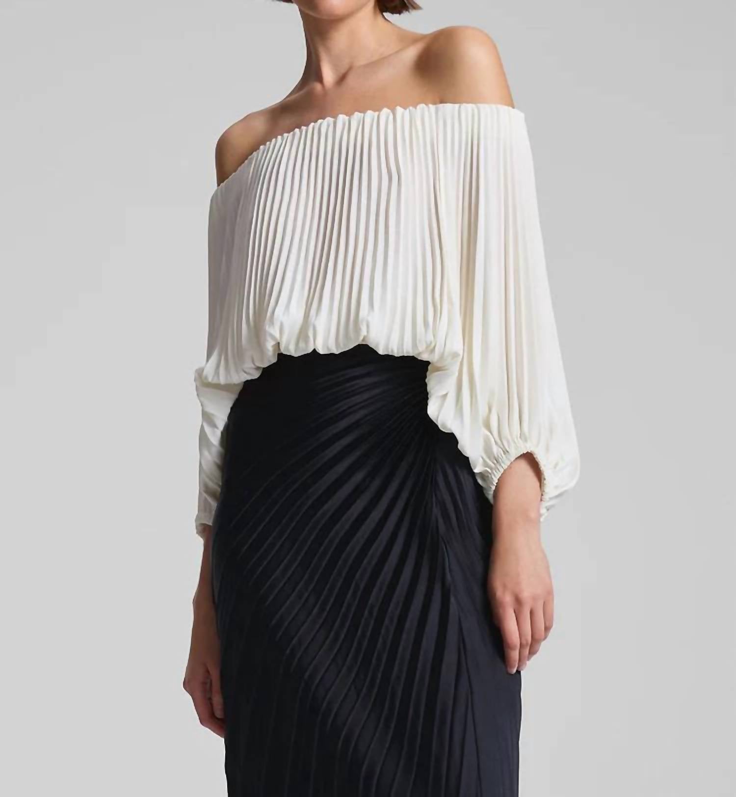 Pair this with your favorite jeans and slides for your next girls night out. The A.L.C. Sienna Satin Pleated Off Shoulder Top in Whisper White is a striking addition to any wardrobe. Featuring long sleeves and an off-the-shoulder neckline, this solid blouse offers timeless elegance with its cropped silhouette and vintage satin material. Composition: 100% Polyester, exclusive of elastic. Closure: Pull on. Care: Dry clean or machine wash cold gentle cycle in a net bag, lay flat to dry. Perfect for spring evening events and exuding quiet luxury for New Year's Eve.