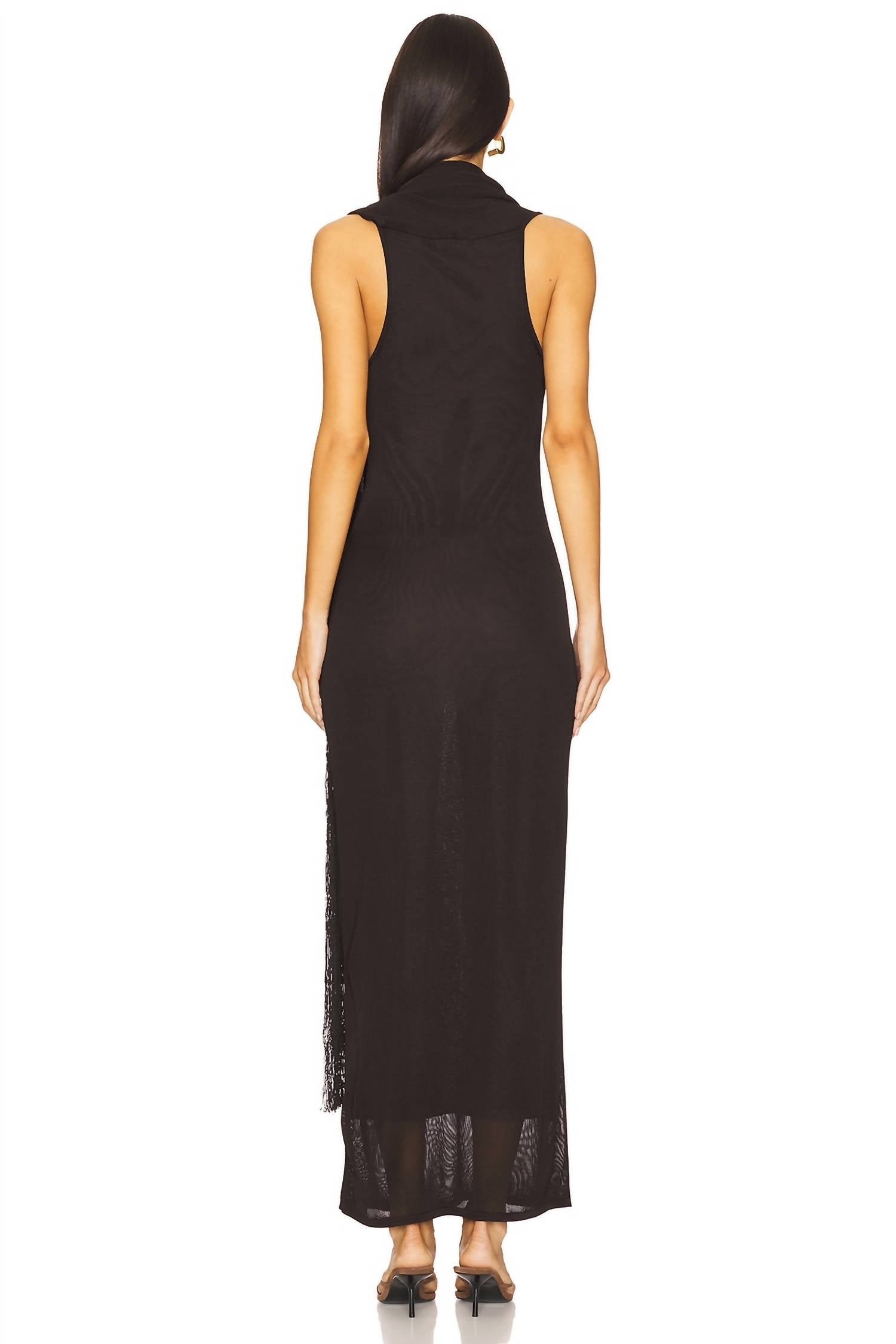 Embrace effortless elegance with the A.L.C. Sonya Dress, a dark brown maxi dress perfect for a holiday party. This sleeveless sheath silhouette features a scoopneck and a plunging neckline, accentuated by an attached scarf with fringe trim for added flair. The dress is crafted from midweight jersey fabric with a semi-sheer finish that highlights its luxurious composition: 97% viscose, 2% nylon, and 1% elastane, fully lined with a soft blend of viscose and elastane. Made in China, it offers pull-on styling and measures approximately 150 cm from shoulder seam to hem. Care: Dry clean only. Model Kaya is 5'10" and wears size small (Waist 24", Bust 32.5", Hips 34").