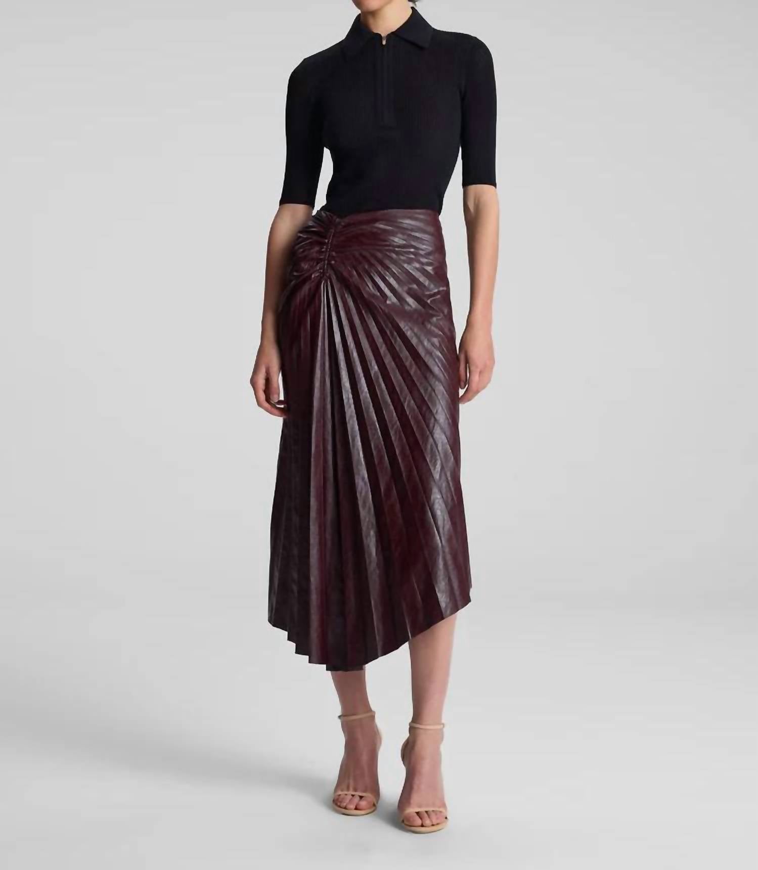 Discover the Tracy Textured Vegan Leather Skirt by A.L.C., a modern piece perfect for your spring wardrobe in cordovan. This solid midi skirt is expertly crafted from a viscose blend composed of 75% viscose, 14% polyester, 7% cotton, and 4% metal, offering both style and structure. The zip closure ensures a sleek fit, ideal for an evening event. Care instructions specify dry clean only, ensuring the longevity of this maximalist design.