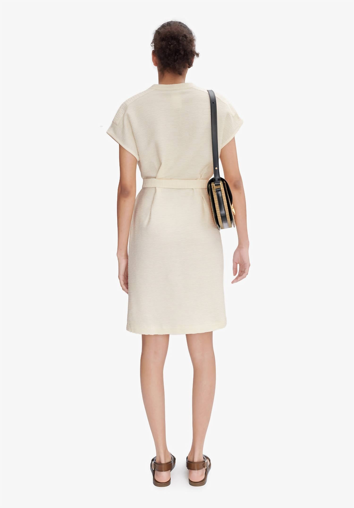 Discover the minimalist charm of the Nico Dress by A.P.C., crafted for vacation elegance in dark navy. Made from 100% cotton with a textured ribbed fabric, this short sleeve sheath dress features a flattering V-neck and a convenient button closure. The dress includes a removable self-tie belt for customizable style. Care instructions: Machine wash cold.