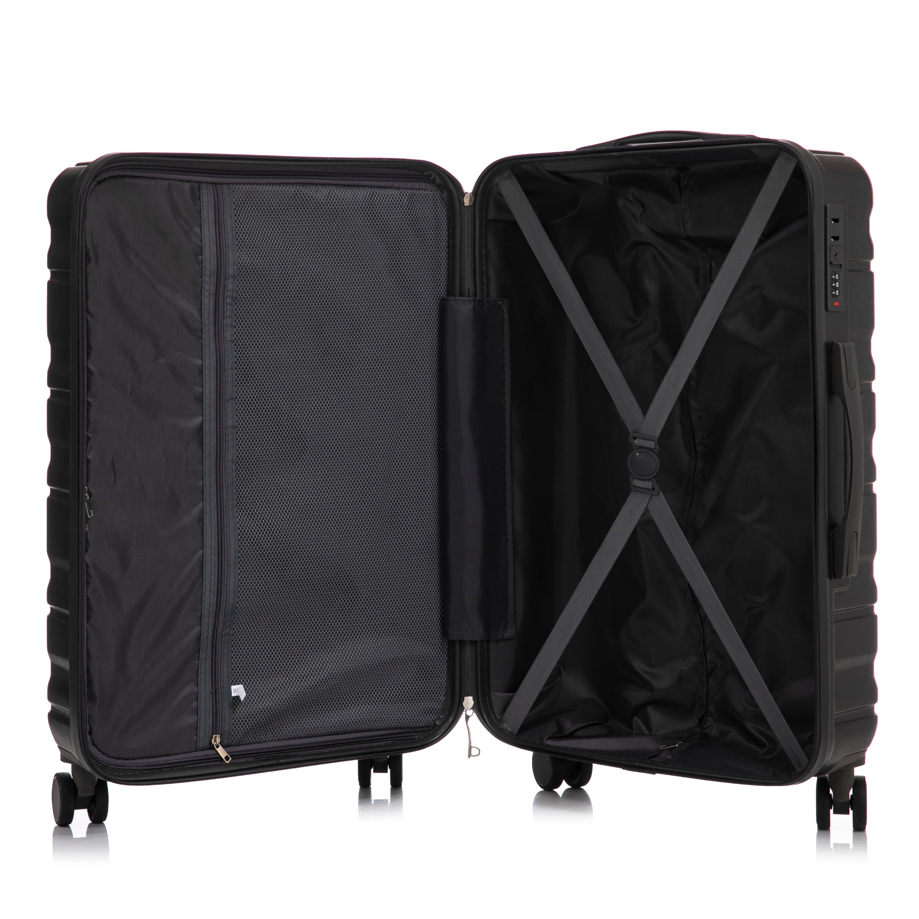 Each suitcase includes a fully lined interior with a zippered compartment, cross straps, and multiple storage layers to keep your belongings neatly organized. The low-profile top and side handles make lifting and carrying easy.