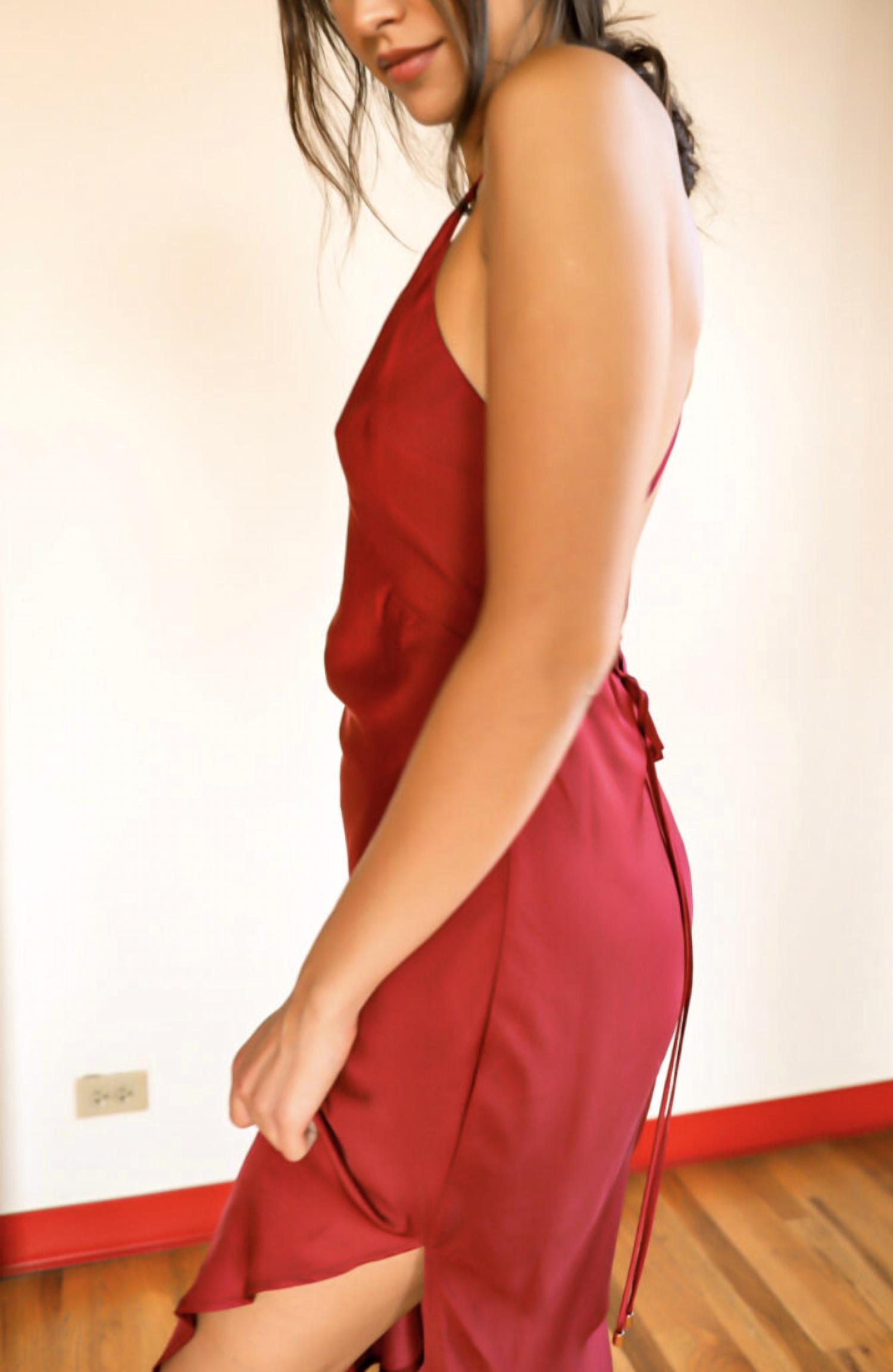 Style this maxi with your favorite statement necklace and sandals for the perfect look. Designed with a fit + flare silhouette that’s achieved through a flowing non-stretch fabrication, cut into panels that thoughtfully follow your curves. The flared skirt reveals a stunning side slit to finish the look. A perfect burgundy maxi for an equally perfect night!