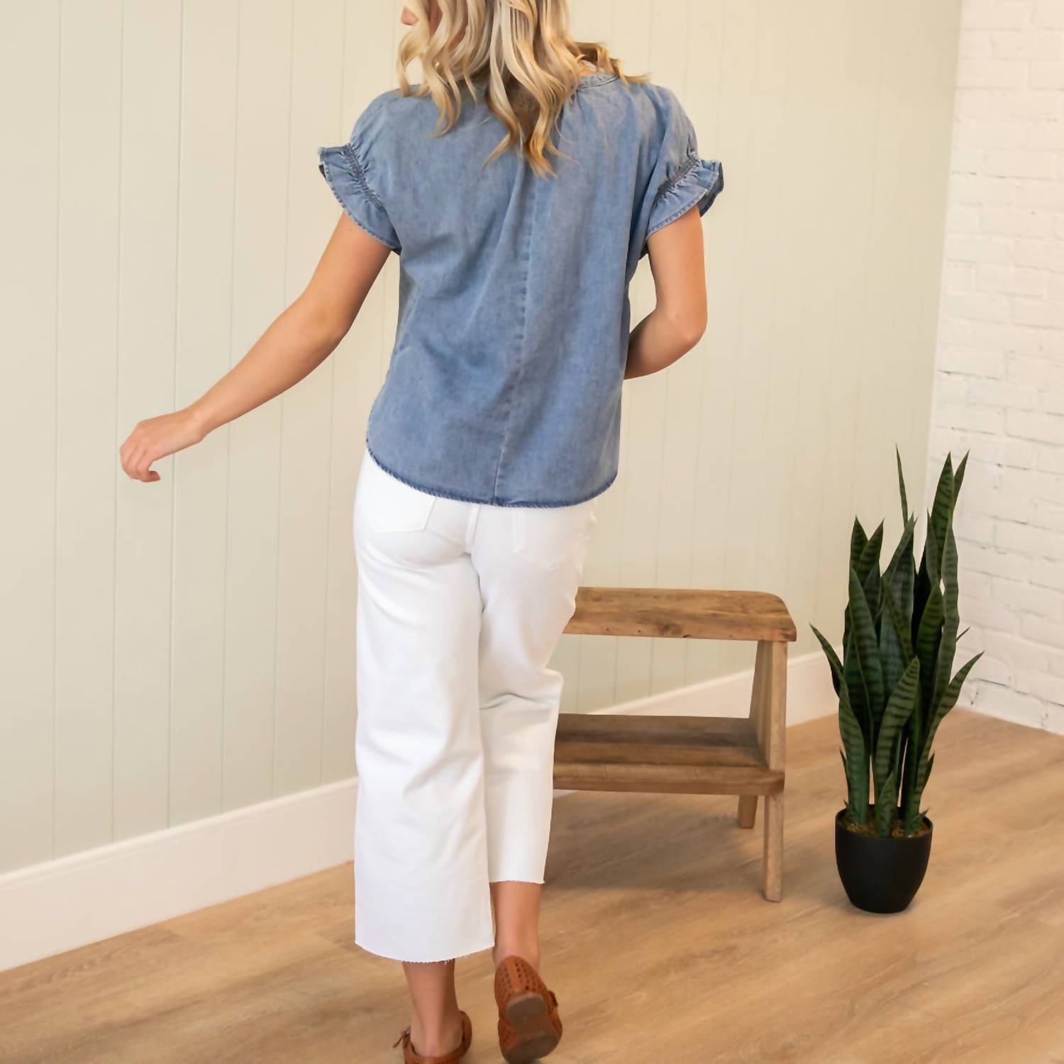 A versatile blouse that works from desk to dinner! Elevate your style with the Denim Puff Sleeve Top by Aapparella, crafted in a solid blue hue perfect for the minimalist wardrobe. This short sleeve blouse features a flattering V-neckline and unique puff sleeves, making it a standout piece for any occasion. Made from sturdy denim material, it ensures long-lasting wear. Closure: Pull on. Care: Machine wash.
