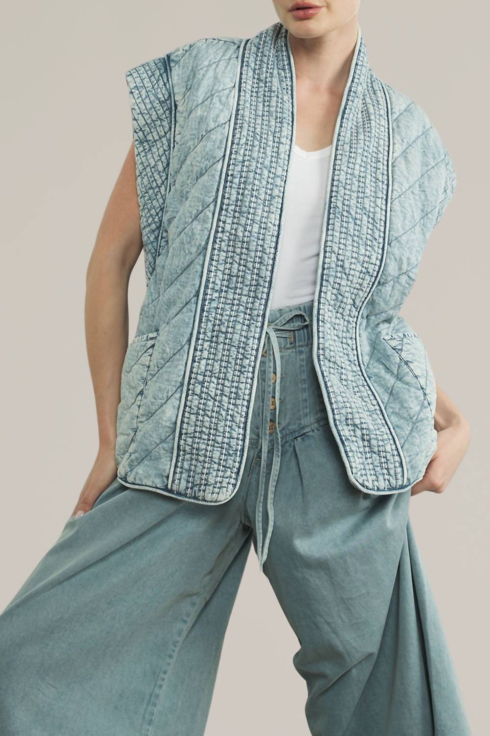 Throw this vest over an all black outfit for a perfectly polished look. Elevate your style with the Denim Quilted Vest by Aaron & Amber, a chic addition to any wardrobe. This women’s vest in a light wash indigo features cap sleeves, textured stitching, and a relaxed pull-on fit for easy layering. Crafted from 100% cotton, its patchwork-inspired details provide a vintage allure, while wide shoulders and an oversized look give it a modern twist. Care is simple with hand wash cold and lay flat to dry instructions, making it effortlessly stylish and practical.