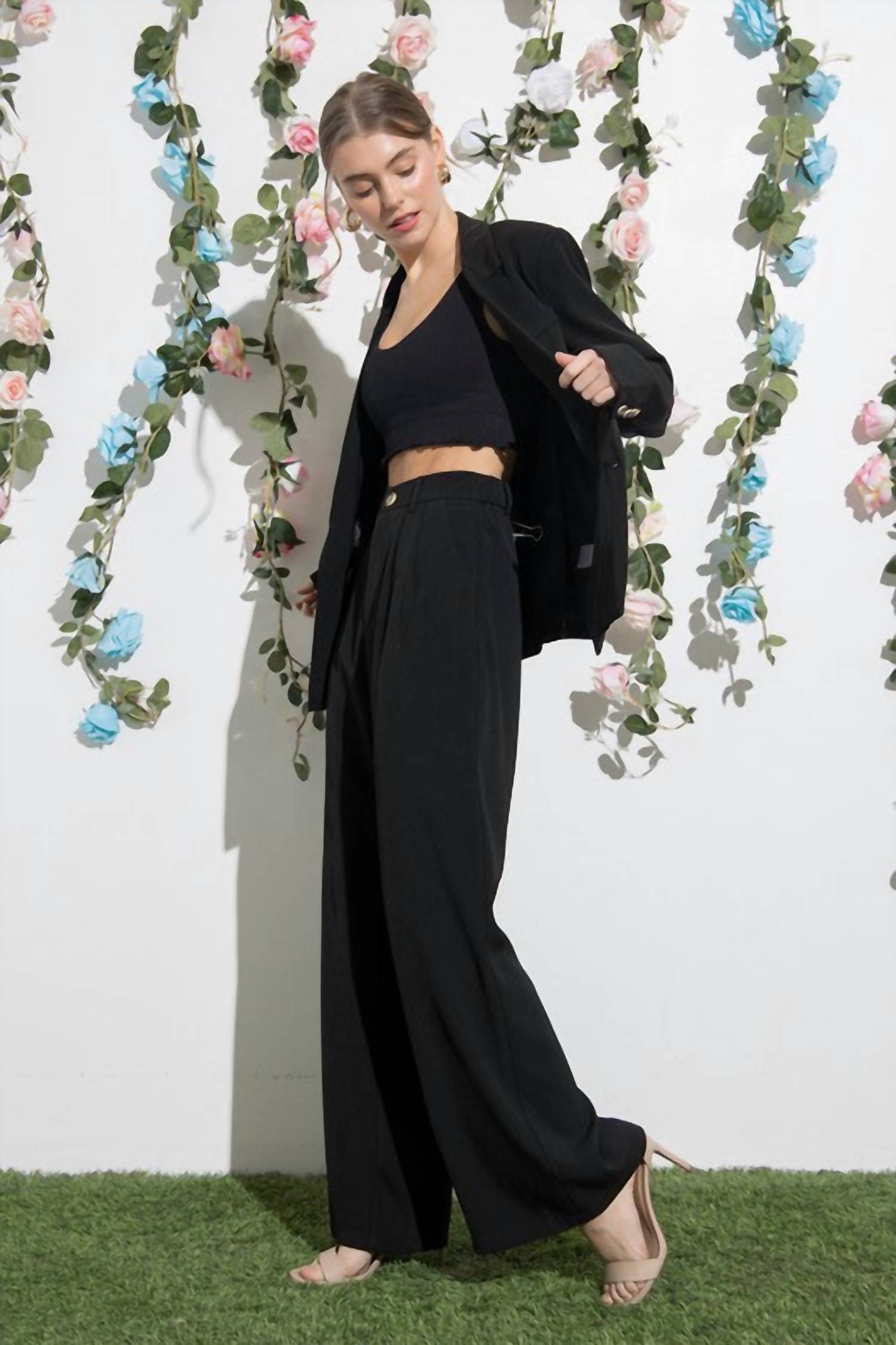 These high-waisted pants showcase a wide-leg design with front pleats, accented by a back elastic for a tailored yet comfortable fit. Made from 100% polyester, they are perfect for creating a polished silhouette. Closure is easy with a button closure, and maintenance is simple with hand wash instructions, avoiding bleach and using low iron if necessary.