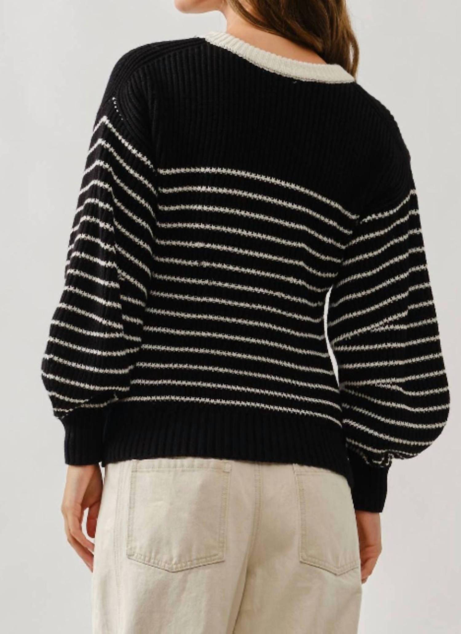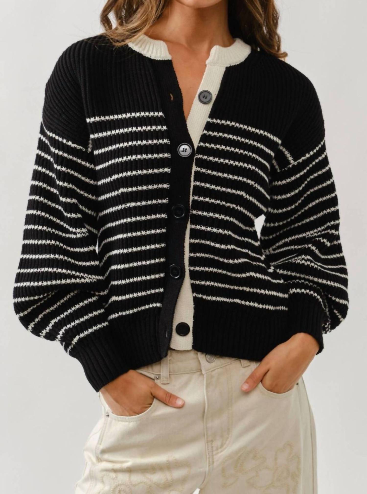 This cardigan will be a sweater-rotation favorite. Introducing the Stripe Balloon Sleeve Cardigan by Aaron & Amber, a chic companion for your minimalist fall wardrobe. Crafted from 100% cotton, this black and cream cardigan boasts long sleeves and a stylish crewneck. Featuring a convenient button closure, it's perfect for a holiday party. Care: Hand wash to keep it looking its best.