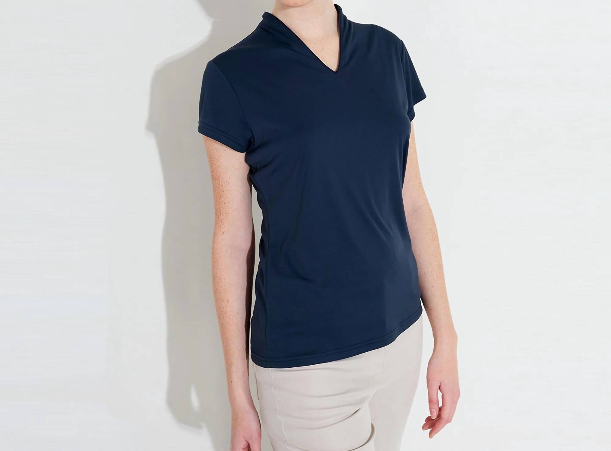 This classic, short sleeve tee will be your go-to staple this season and beyond. Combines sustainable fashion with functionality. Crafted from soft and stretchy recycled polyester material. Features a flattering V-neckline with thin piping and short sleeves, making it ideal for spring fitness or workout sessions. Designed for athleisure, incorporates DryCool properties for enhanced breathability, ensuring you stay comfortable. Care is easy with machine washing. Pull-on closure adds convenience.