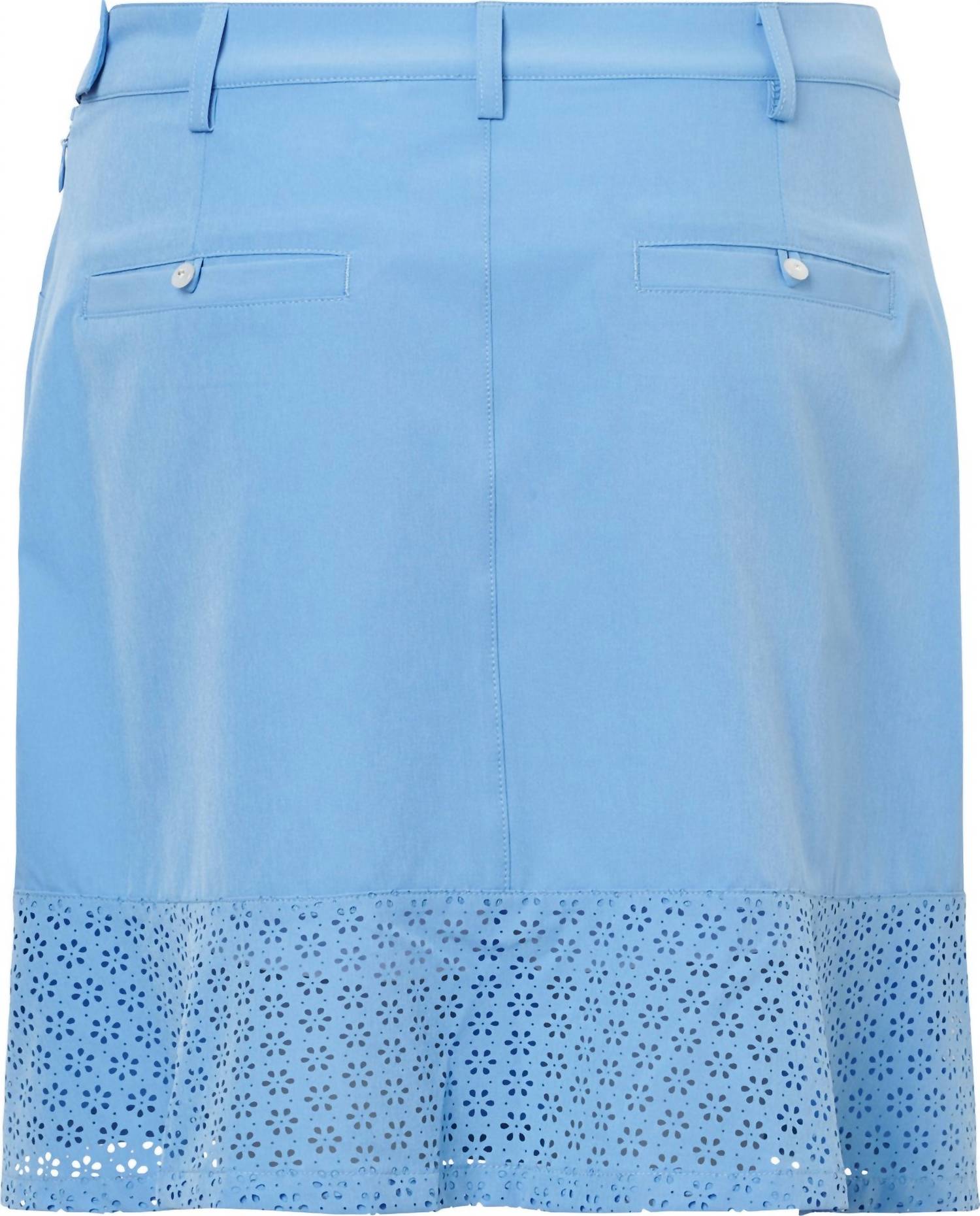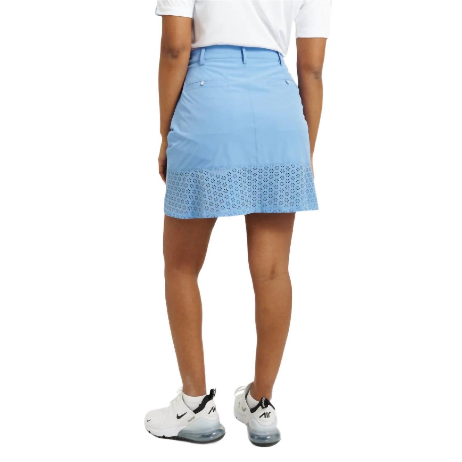 Introducing the Manga Golf Skorts by Abacus Sportswear US, crafted from breathable nylon in an elegant heaven hue. This women’s skort offers a sleek front with a side zipper, integrated shorts, and a stylish perforated floral pattern at the back for a lovely drape. Designed for both active pursuits and casual wear, it features practical belt loops, two side pockets, and two buttoned back pockets for all your essentials. Care instructions include machine wash and tumble dry, making it a practical addition to your athleisure game day wardrobe.