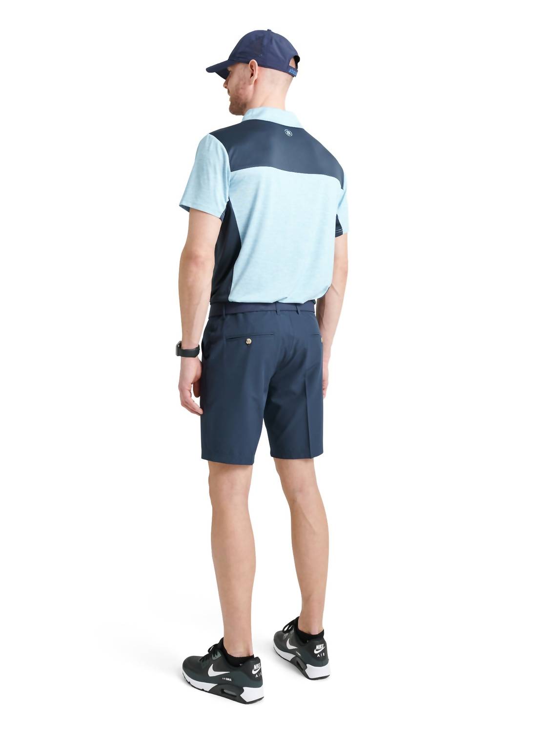 Elevate your fitness wardrobe. Features short sleeves and a unique cut-and-sewn collar with a zip closure for modern style and function. Enjoy the comfort of its soft and stretchy knit that boasts Dry Cool and breathable properties, with melange on the main body and solid contrast on the shoulder, back yoke, and side panels. Machine wash, perfect for your spring athleisure look during workouts and fitness activities.