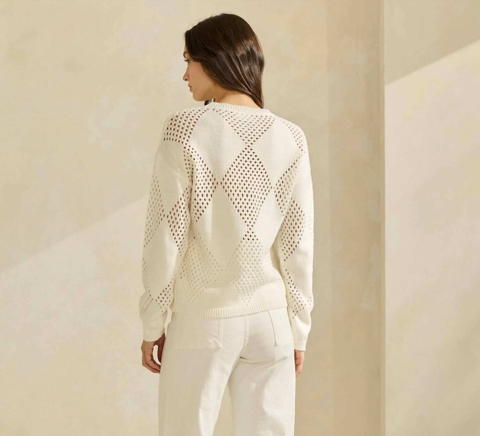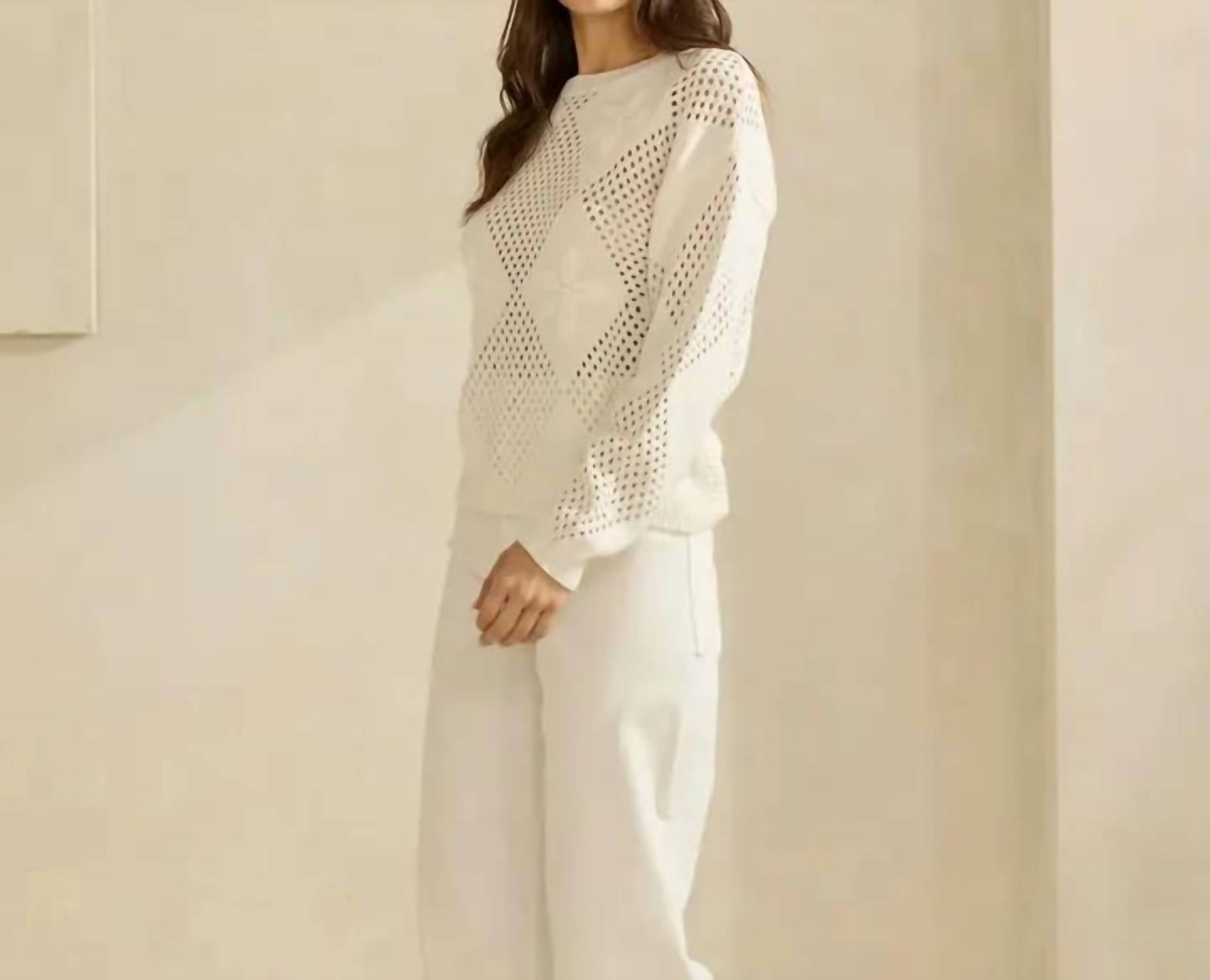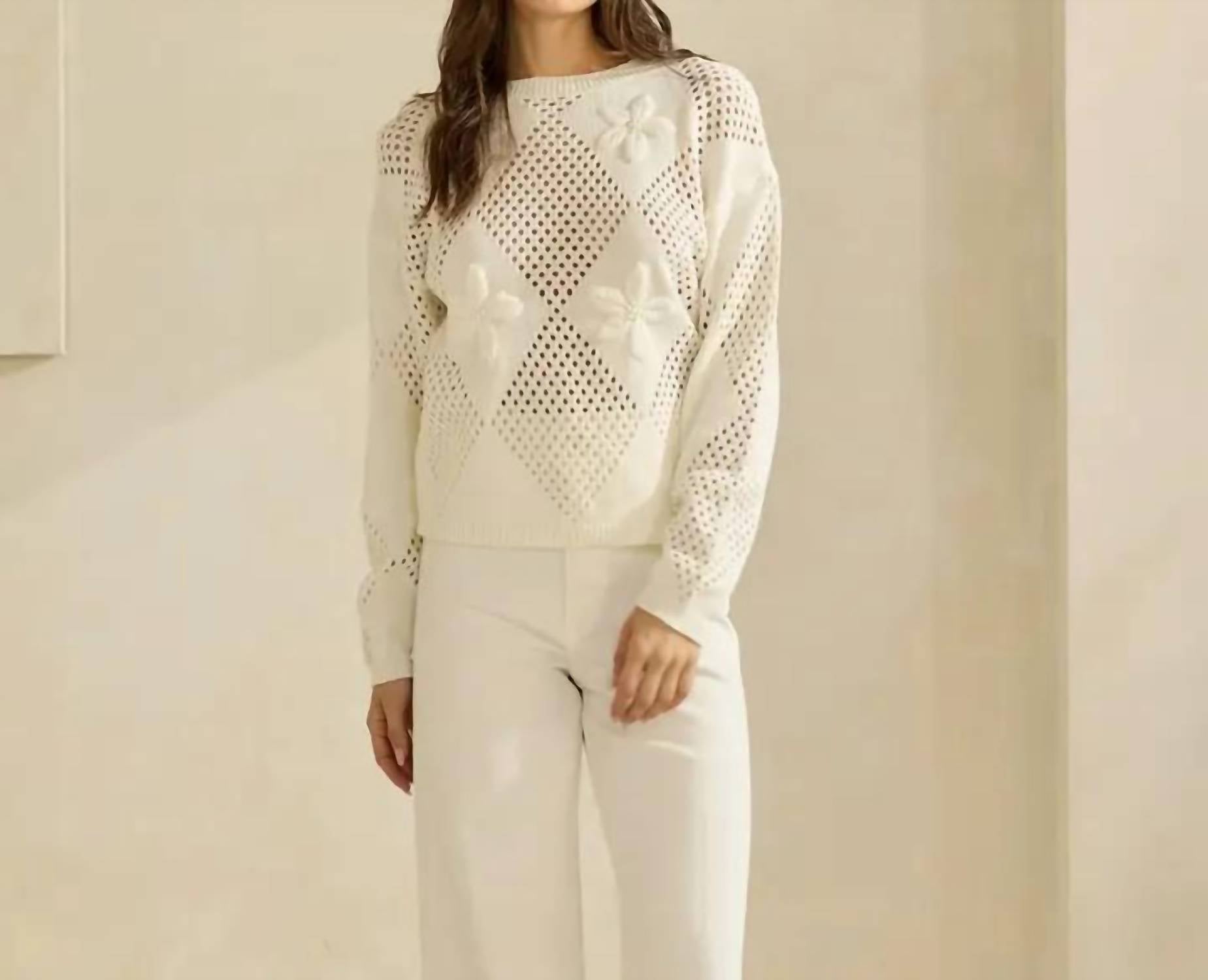 Stay warm and stylish in this versatile and effortlessly cool knitwear staple. Wear it alone or layered, it's the perfect sweater for the season and you'll wish you had it in every color. Introducing the Flower Embroidered Openwork Sweater Top by ABLE, a stylish cream piece perfect for any springtime occasion. Featuring long sleeves and a charming diamond pattern, this crewneck sweater effortlessly combines elegance and comfort. Its composition of 55% acrylic and 45% cotton ensures a soft yet durable wear. For lasting care, hand wash cold and hang to dry. Model is wearing a size small (5'8" height).