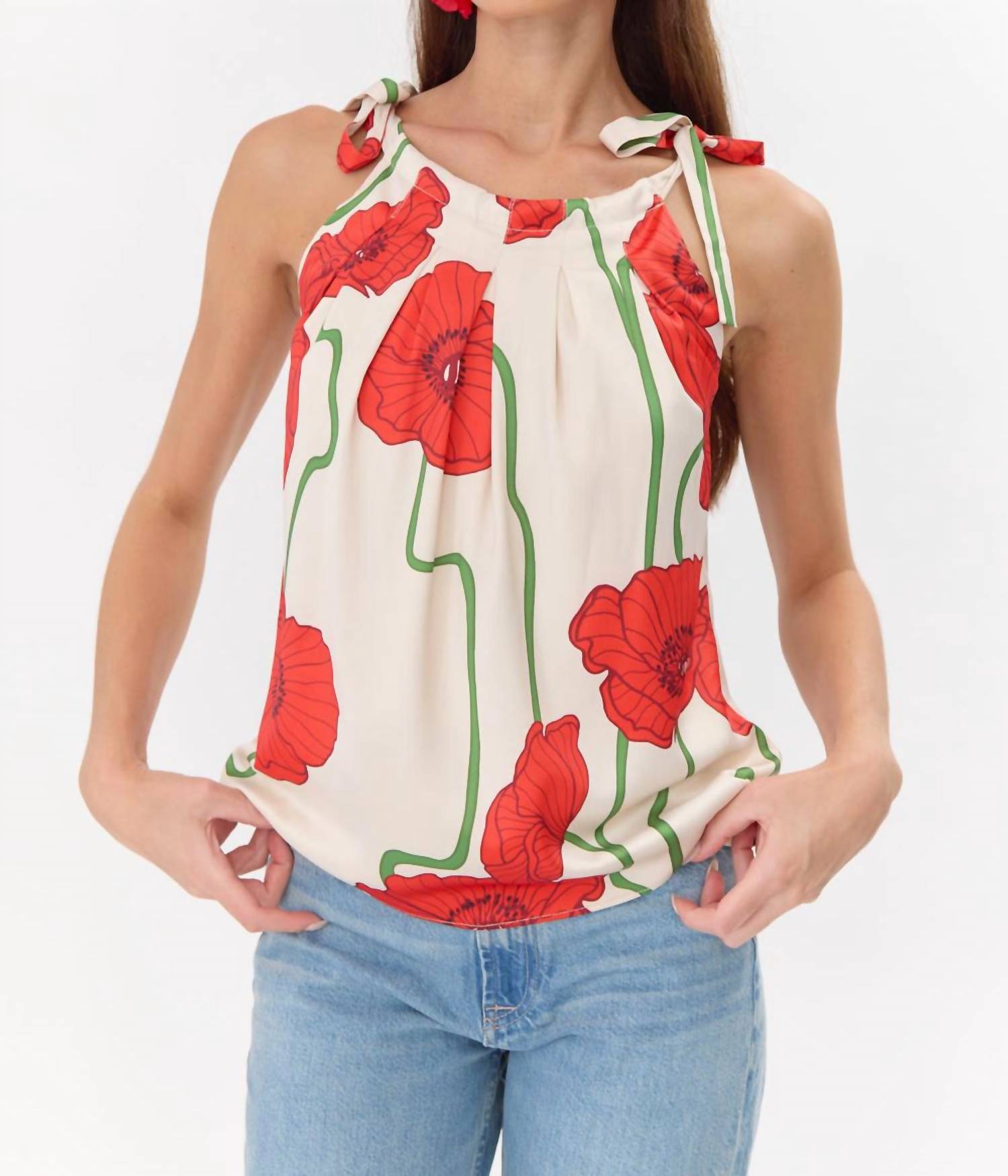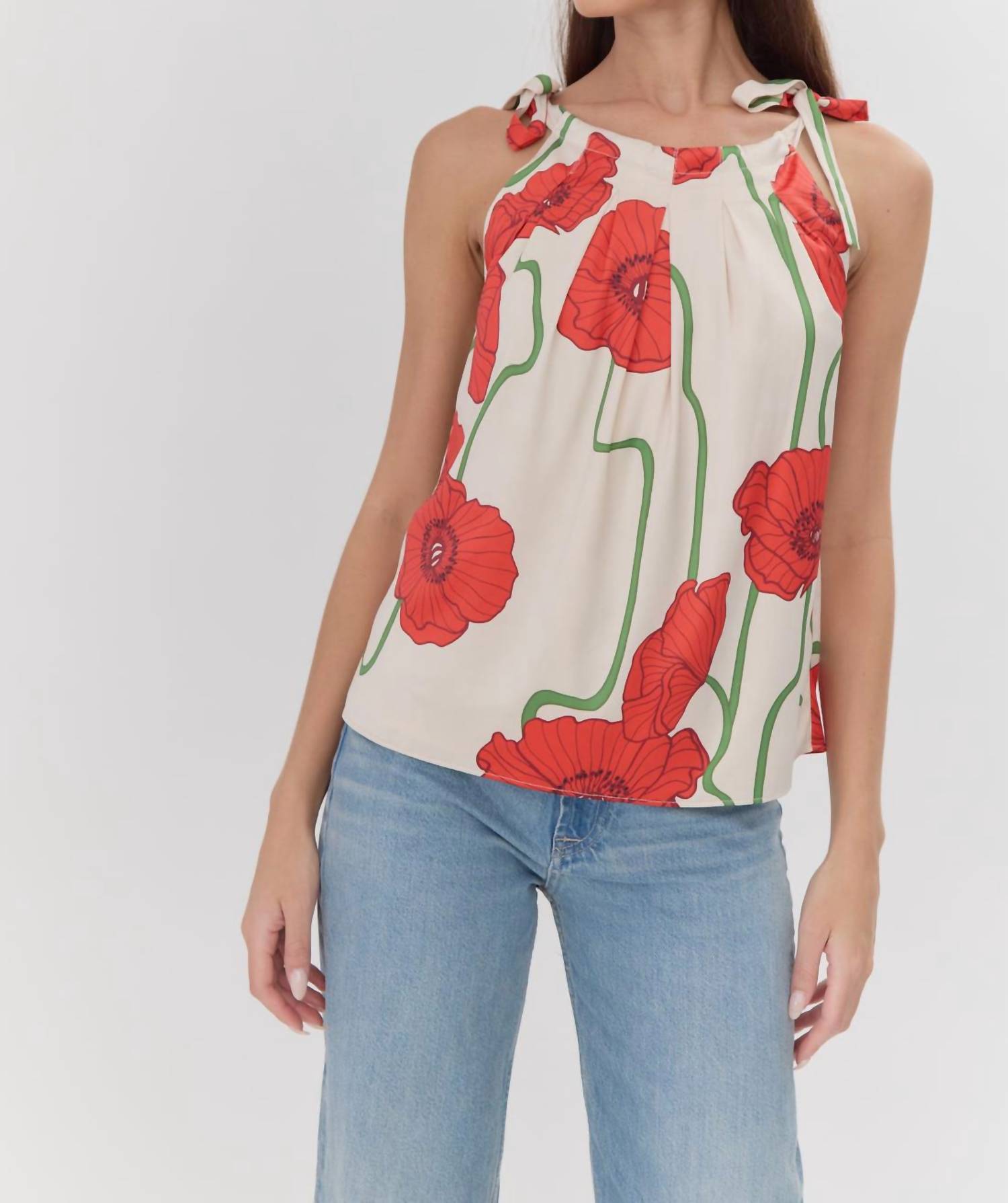 A versatile blouse that works from desk to dinner! The Anaia Abstract Rose Print Side Tie Top by Adelyn Rae is a stunning addition to your wardrobe with its sleeveless design and boho chic flair. Showcasing a beautiful cream and red floral pattern, this blouse features a crewneck and a convenient pull-on closure for ease of wear. Perfect for spring vacations, it adds a touch of elegance to any outfit. Care: Dry clean only.