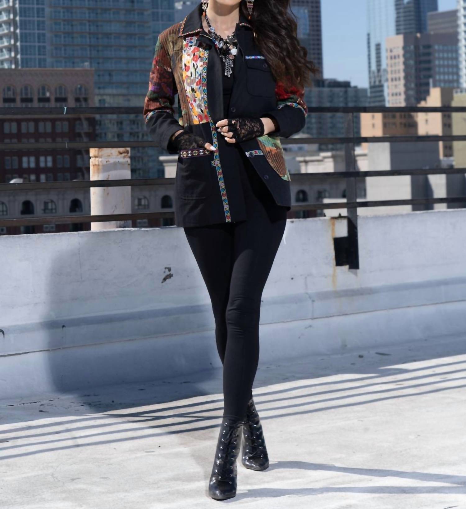 Meet the Belted Mix Media Jacket by Adore, a statement piece in black with vibrant floral prints and embroidered panels. This casual women's jacket features long sleeves and a collared neckline, cinched with a matching patterned belt for an adjustable fit. Crafted with attention to detail, it includes buttoned cuffs and front patch pockets for added structure and functionality. Made in China, this jacket closes with buttons and requires hand washing for maintenance.