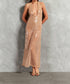 The Sequins Plunge-Neck Long Dress by Adriana Degreas embodies elegance in a stunning champagne hue, perfect for evening events. This sleeveless sheath dress is crafted from polyester with a deep scoop neck that beautifully complements its minimalist design. Closure is easy with a pull-on style, and it's best cared for by hand washing. Ideal for making a statement at any fall soirée, this piece is the epitome of refined sophistication.