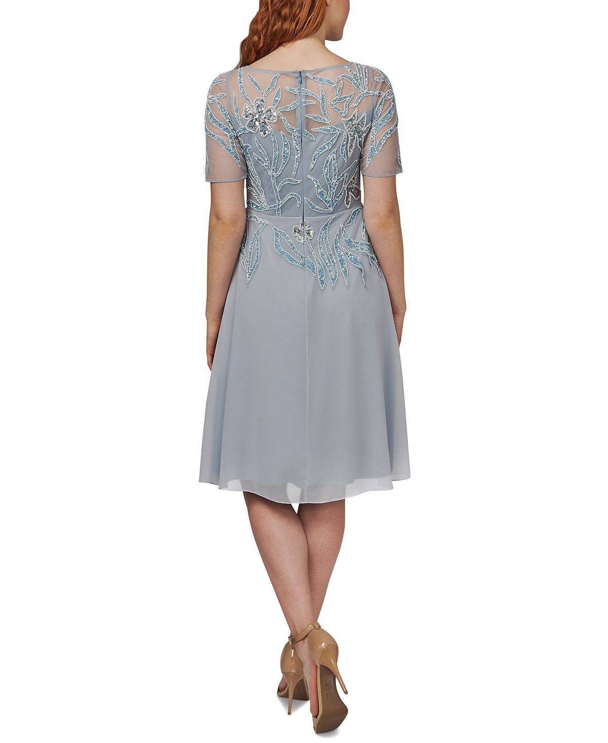 With a full skirt and sparkling beaded details| this cocktail dress from Adrianna Papell is perfect for your next special event. | Approx. 43-1/2 long from center back neck to hem| Square neckline| Zipper closure at back| Sequin details at top; mesh at top and sleeves| Lined