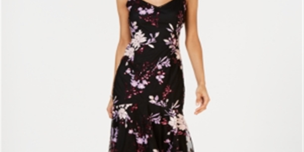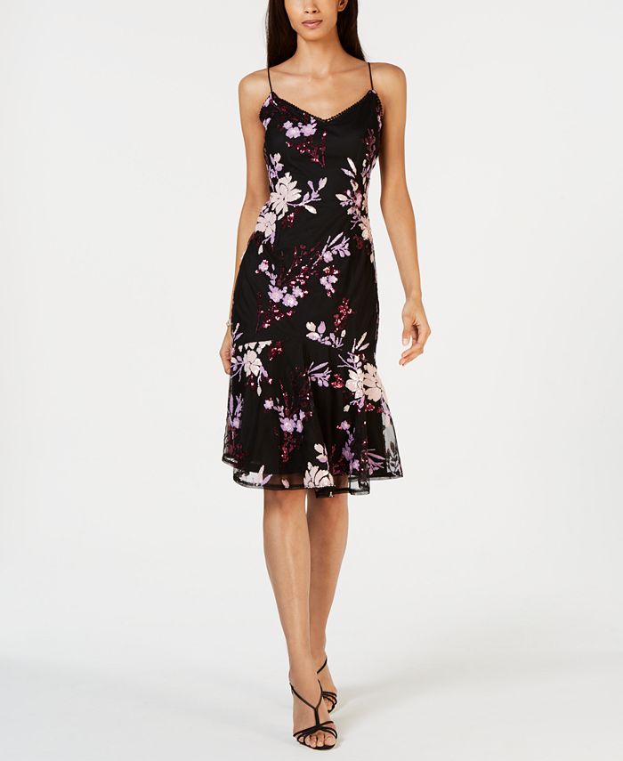 Adrianna Papell takes a simple sheath and turns it into a masterpiece with stunning floral sequins| a flirty ruffle hem and delicate crocheted details.| Approx. 33-3/16 long from center back neck to hem. Length is based on size 4 and varies 1/4 between sizes.| V-neck with crochet trim and thin straps; Sheath silhouette| Hidden back zipper with hook-and-eye closure | Allover floral sequin details; ruffle hem
