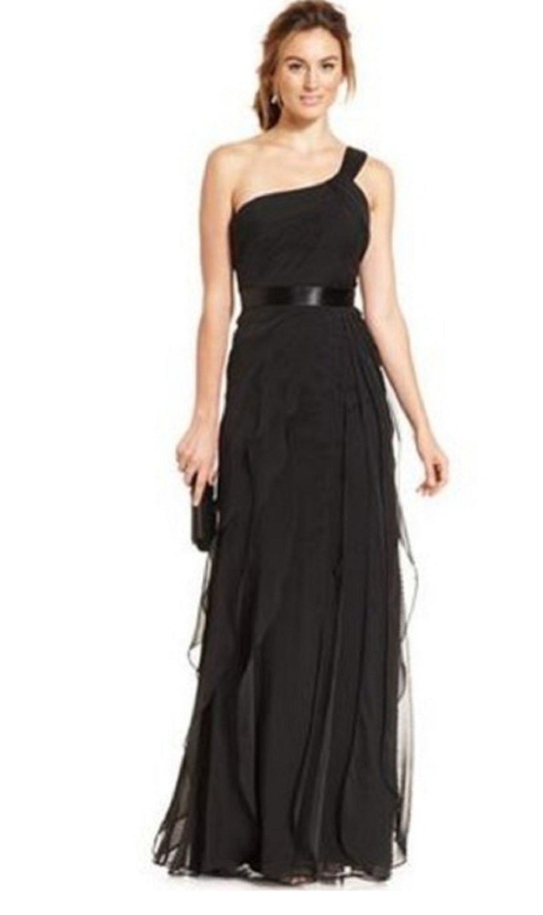 Adrianna Papell Women's One Shoulder Tiered Chiff Asymetrical Neckline Full Length Evening Dress Black Size 6