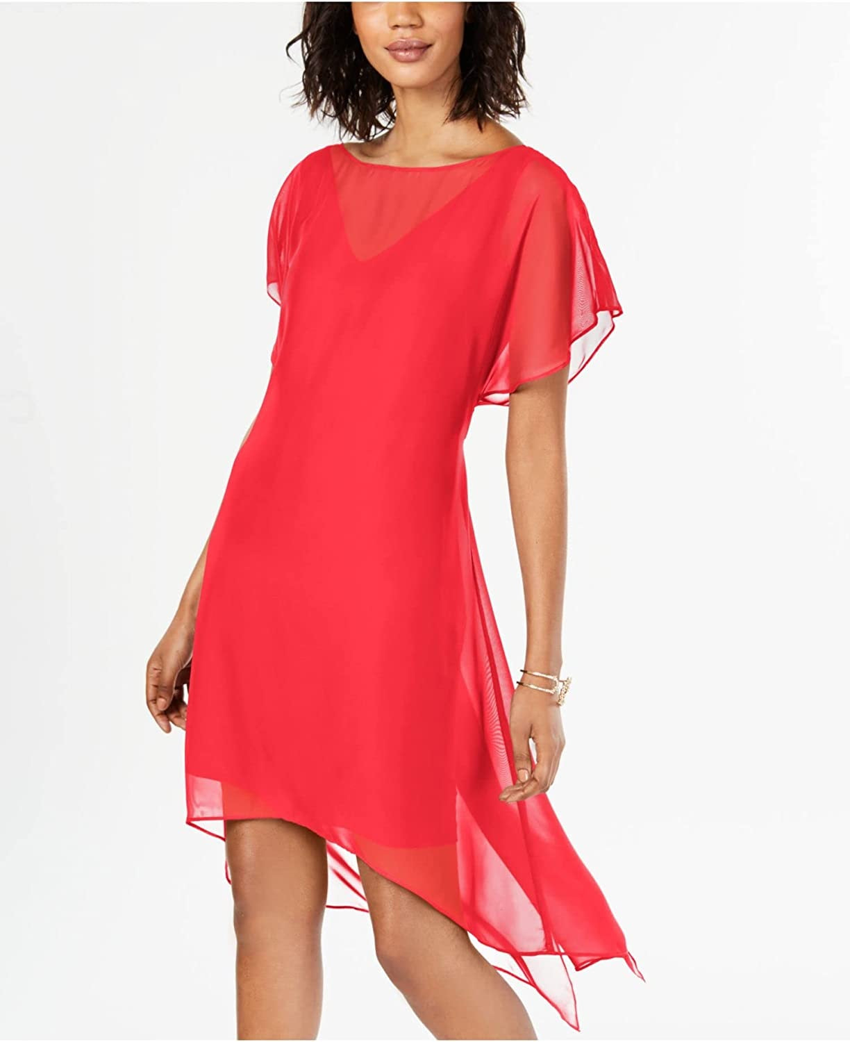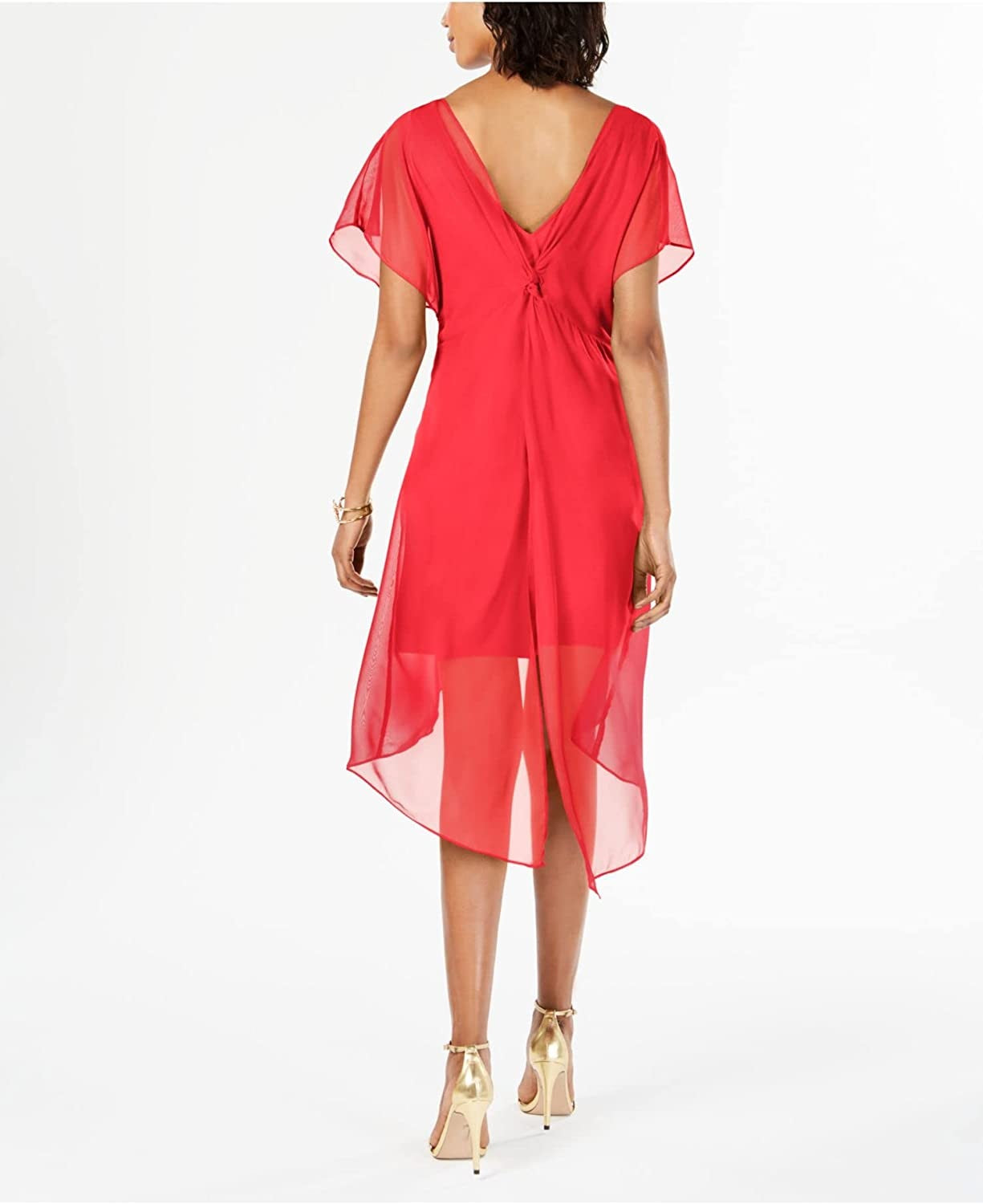 Adrianna Papell Women's Sheer Overlay V Twist Back Lined Flutter Sleeve Illusion Neckline Midi Dress Coral Size X-Large