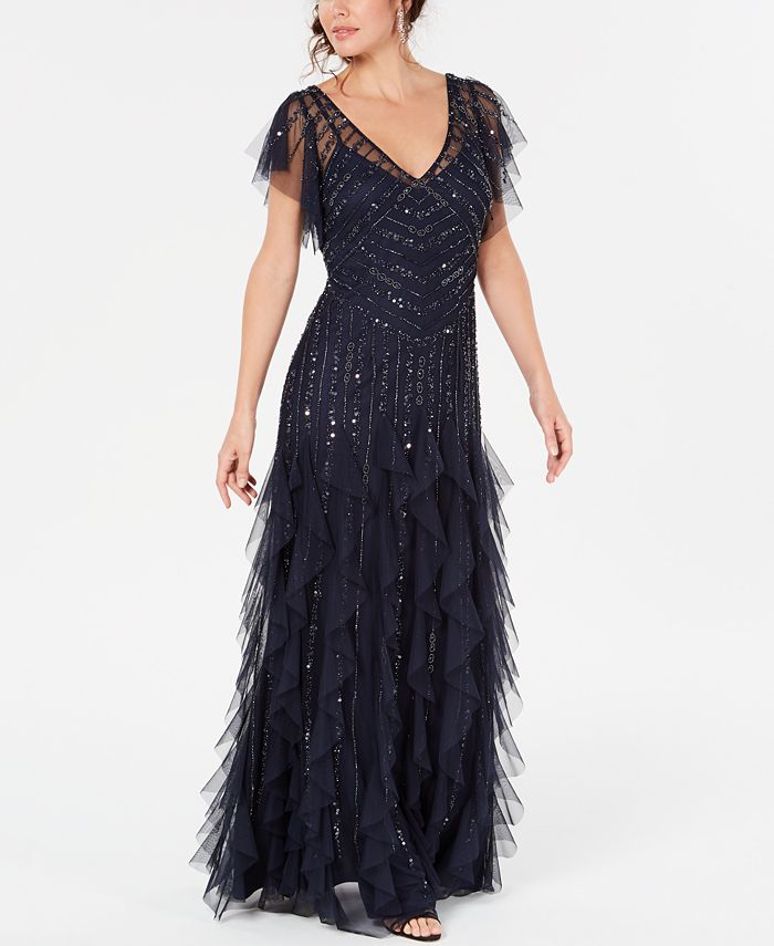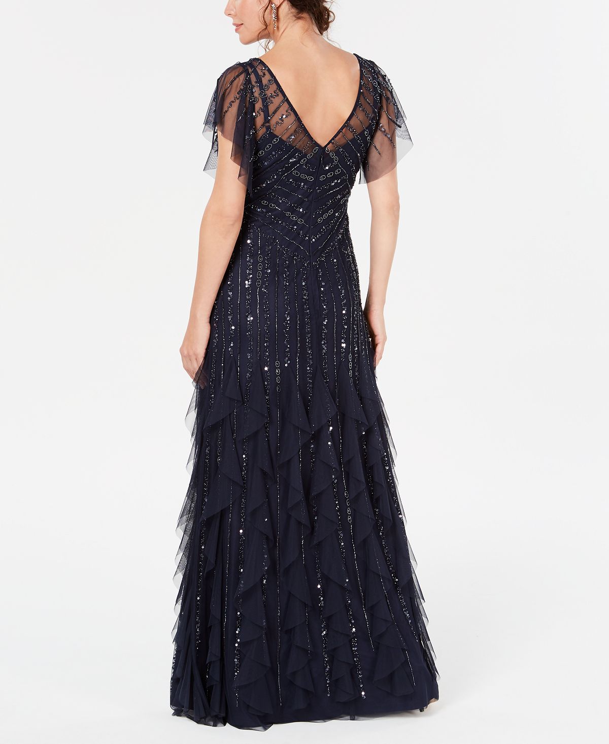 Sparkle from dusk to dawn. Adrianna Papell's glittery light-catching gown swishes| sway & takes the dance floor by storm. | Approx. 52" long from center back neck to hem. Length is based on size 4 and varies 1/4" between sizes| V-neck; Gown silhouette| Hidden back zipper closure| Short flutter split sleeves