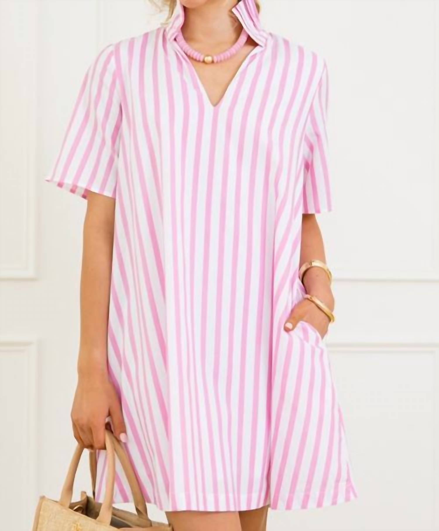 The perfect mini dress for those warmer months. Step into summer with ease in the Olivia Dress by ADRIENNE, a vibrant choice in Sky Ten Stripe perfect for your vacation getaway. Featuring a classic collared neckline and short sleeves, this mini shirt dress is crafted from a comfortable cotton blend for a breezy feel. Practical pockets add functionality, making it an ideal companion for warm weather outings. Ideal for the fashion-forward woman, this dress is a seasonal must-have.