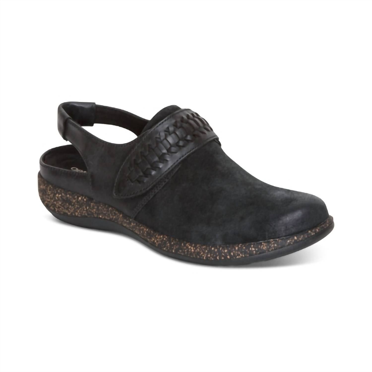 Genuine leather and nubuck slingback clog features arch support and Cobra Orthotic. Hook and loop closure. Lightweight rubber outsole. Removable Insole. 1.31" Heel height. True to size. Hand wash.