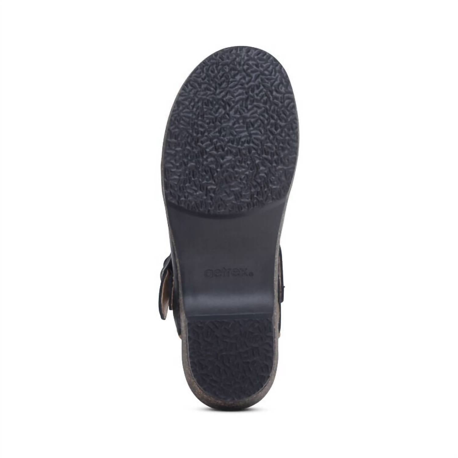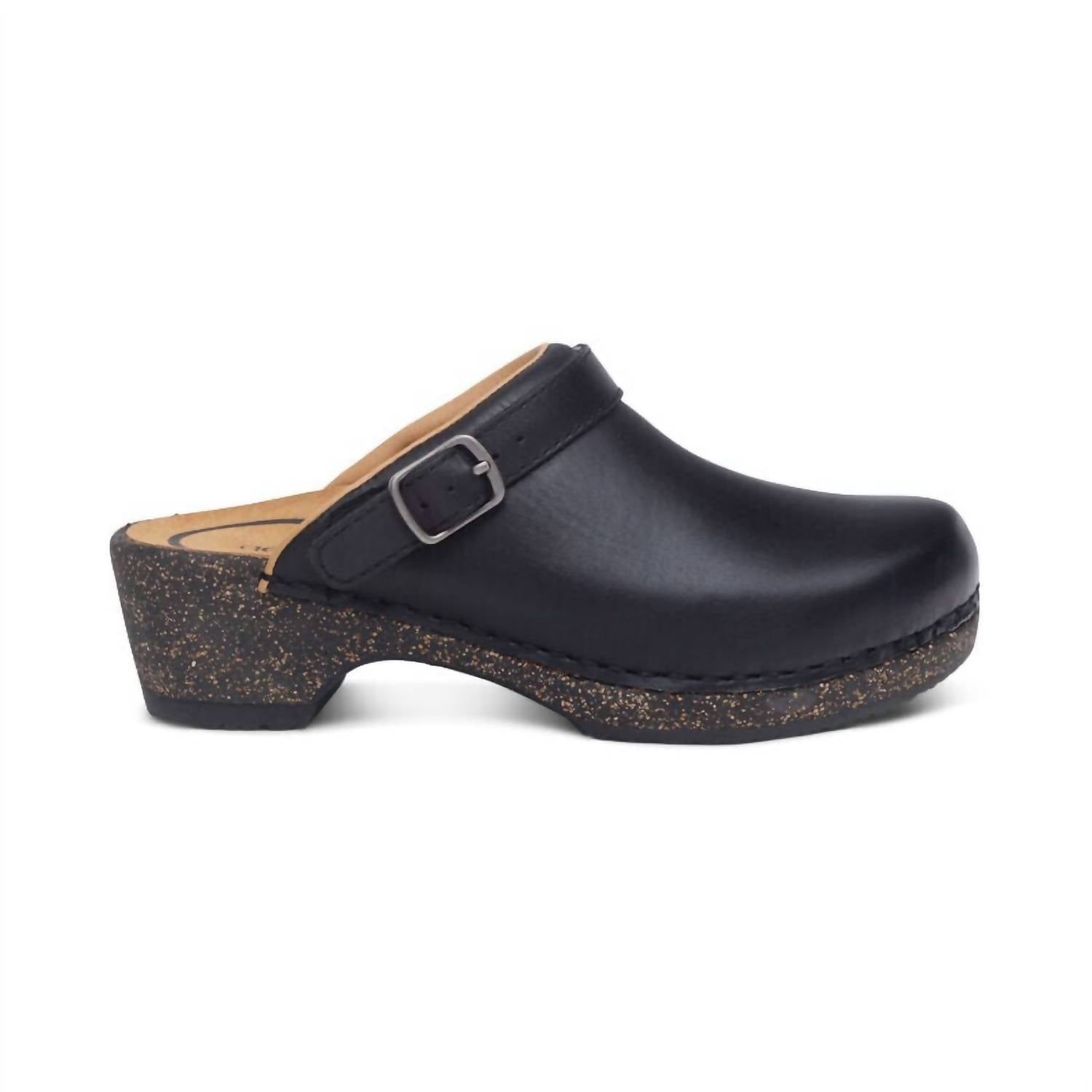 Leather upper. Functional heel strap. Lightweight cork midsole. Arch support helps to stabilize and align feet. Arch support helps to relieve common foot pain and plantar fasciitis. The memory foam foot-bed provides cushioning and comfort. 2" heel.