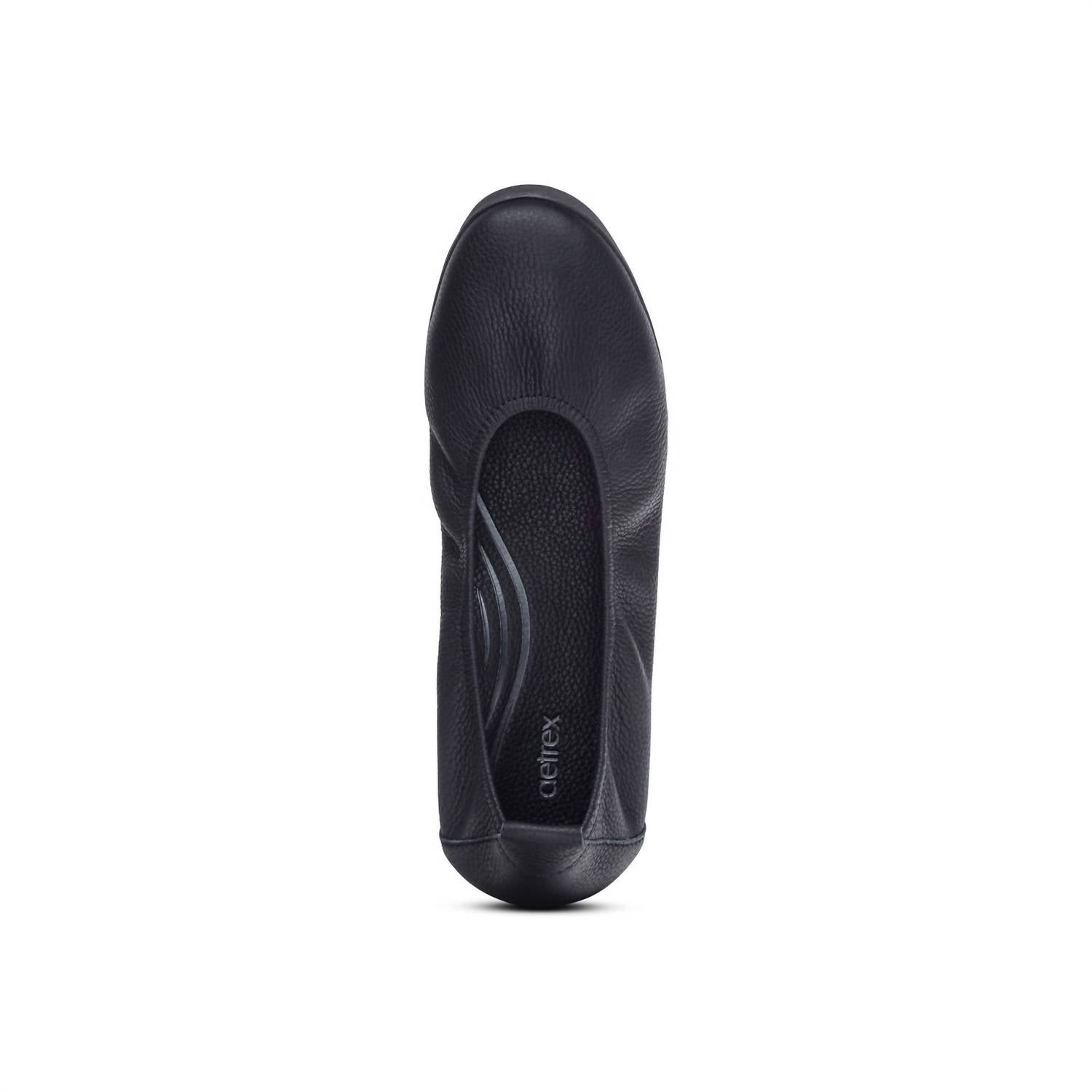 A classic loafer that is both comfortable and polished. Step into unparalleled comfort with the Aetrex Women's Brianna Shoes in classic black. Designed with arch support to stabilize and align your feet, these shoes help alleviate foot pain and plantar fasciitis, making them perfect for all-day wear. Crafted with a soft nubuck and pebble grain leather upper, they feature a round toe and a stretchy topline for adjustability. The 1.25-inch wedge heel and memory foam midsole offer additional cushioning, while the lightweight rubber outsole ensures durability.
